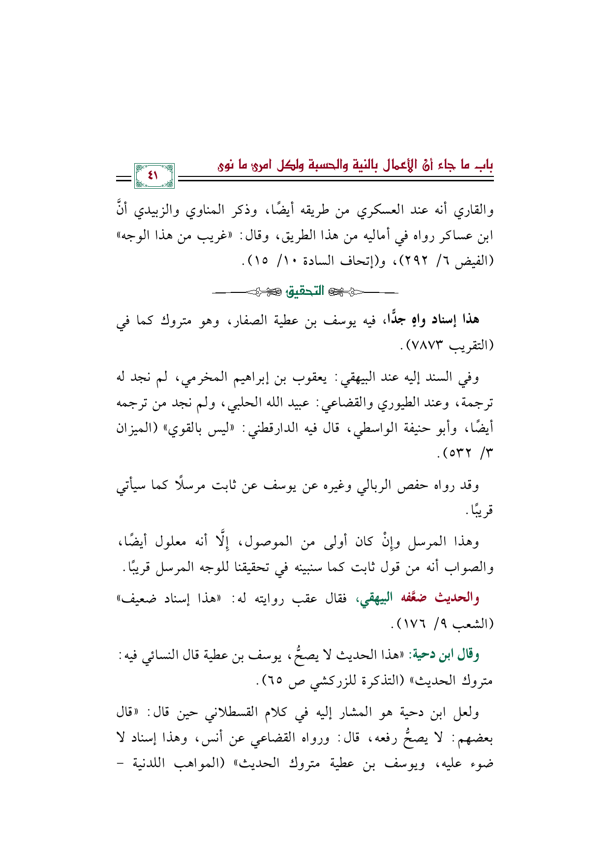 والقاري أنه عند العسكري من طريقه أيضًا، وذكر المناوي والزبيدي أنَّ ابن عساكر رواه في أماليه من هذا الطريق، وقال: «غريب من هذا الوجه» (الفيض ٦/ ٢٩٢)، و (إتحاف السادة ١٠/ ١٥).