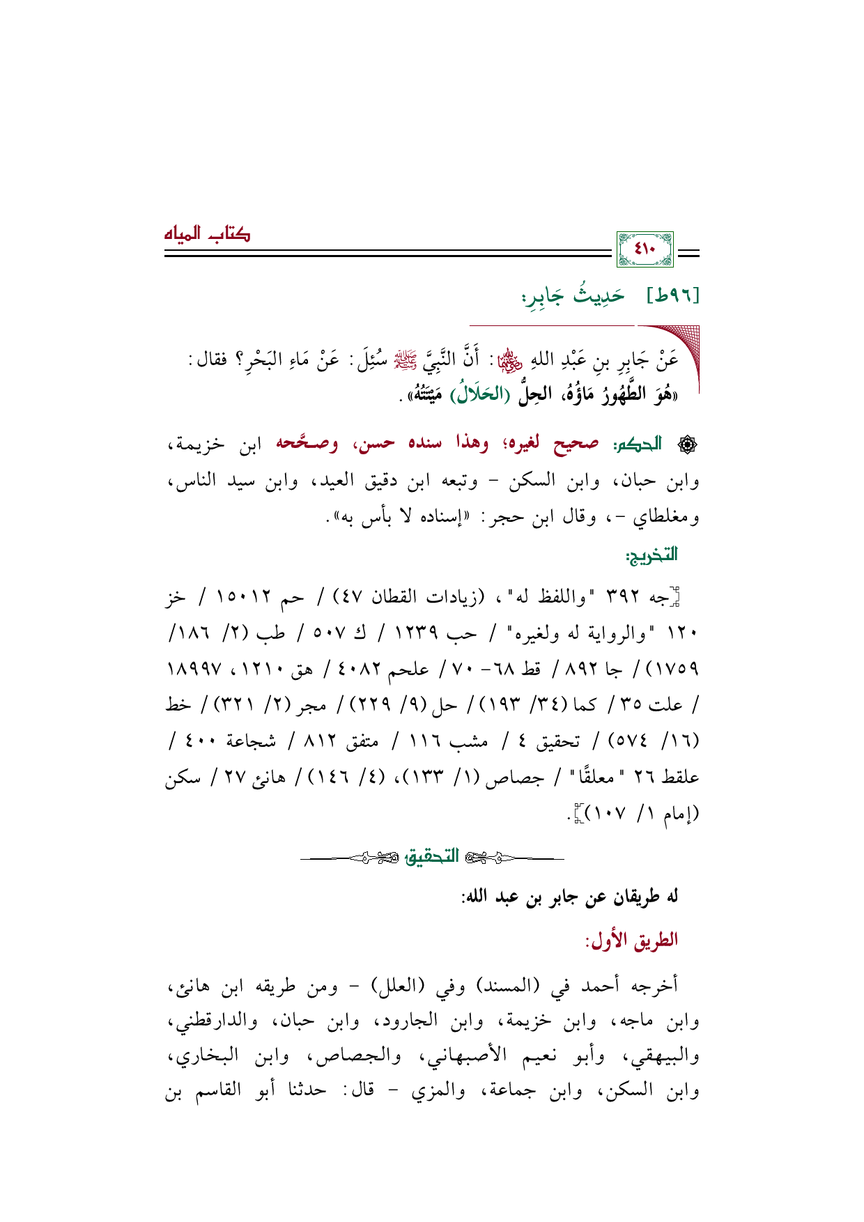 ◼ عَنْ جَابِرِ بنِ عَبْدِ اللهِ رضي الله عنهما: أَنَّ النَّبِيَّ صلى الله عليه وسلم سُئِلَ: عَنْ مَاءِ البَحْرِ؟ فقال: ((هُوَ الطَّهُورُ مَاؤُهُ، الحِلُّ (الحَلَالُ) مَيْتَتُهُ)).