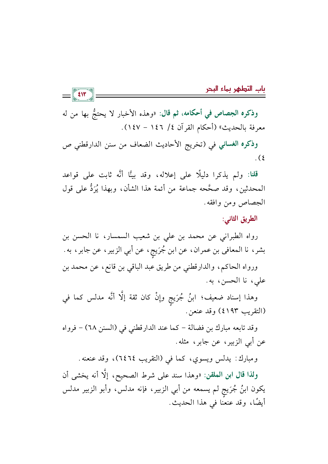 ولذا قال ابن الملقن: ((وهذا سند على شرط الصحيح، إلَّا أنه يخشى أن يكون ابنُ جُرَيجٍ لم يسمعه من أبي الزبير، فإنه مدلس، وأبو الزبير مدلس أيضًا، وقد عنعنا في هذا الحديث.