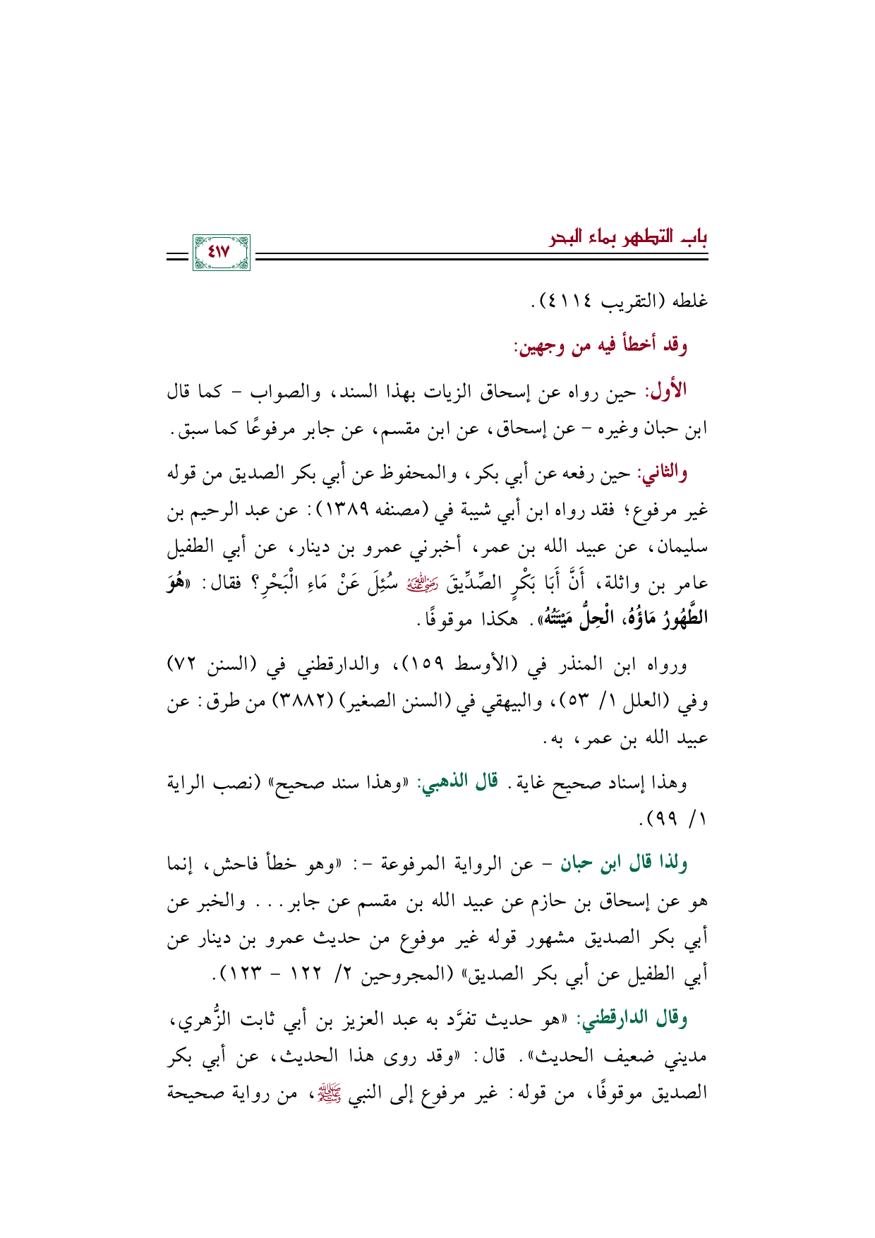 والثاني: حين رفعه عن أبي بكر، والمحفوظ عن أبي بكر الصديق من قوله غير مرفوع؛ فقد رواه ابن أبي شيبة في (مصنفه ١٣٨٩): عن عبد الرحيم بن سليمان، عن عبيد الله بن عمر، أخبرني عمرو بن دينار، عن أبي الطفيل عامر بن واثلة، أَنَّ أَبَا بَكْرٍ الصِّدِّيقَ رضي الله عنه سُئِلَ عَنْ مَاءِ الْبَحْرِ؟ فقال: ((هُوَ الطَّهُورُ مَاؤُهُ، الْحِلُّ مَيْتَتُهُ)). هكذا موقوفًا.