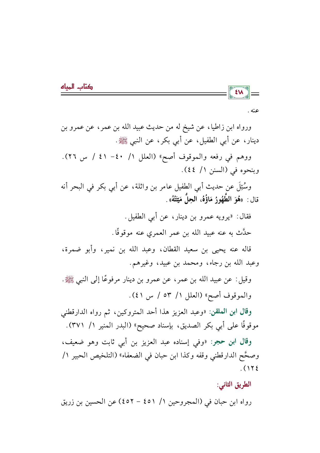 وسُئِلَ عن حديث أبي الطفيل عامر بن واثلة، عن أبي بكر في البحر أنه قال: ((هُوَ الطَّهُورُ مَاؤُهُ، الحِلُّ مَيْتَتُهُ)).