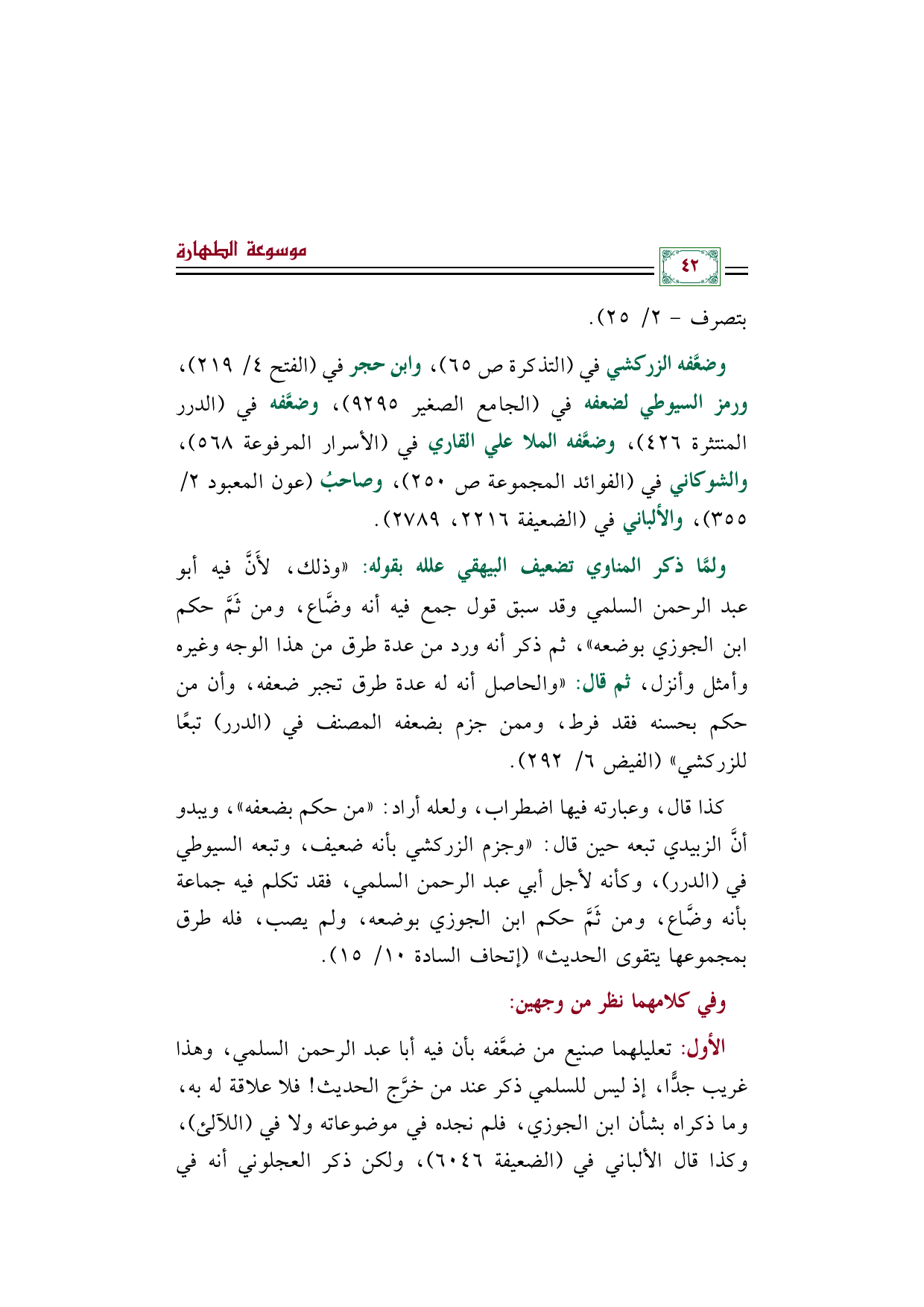 ولمَّا ذكر المناوي تضعيف البيهقي علله بقوله: «وذلك، لأَنَّ فيه أبو عبد الرحمن السلمي وقد سبق قول جمع فيه أنه وضَّاع، ومن ثَمَّ حكم ابن الجوزي بوضعه»، ثم ذكر أنه ورد من عدة طرق من هذا الوجه وغيره وأمثل وأنزل، ثم قال: «والحاصل أنه له عدة طرق تجبر ضعفه، وأن من حكم بحسنه فقد فرط، وممن جزم بضعفه المصنف في (الدرر) تبعًا للزركشي» (الفيض ٦/ ٢٩٢).