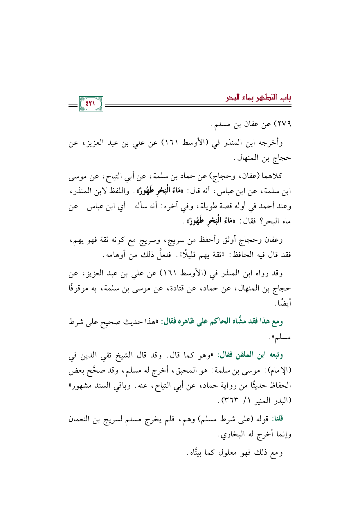 كلاهما (عفان، وحجاج) عن حماد بن سلمة، عن أبي التياح، عن موسى بن سلمة، عن ابن عباس، أنه قال: ((مَاءُ الْبَحْرِ طَهُورٌ)). واللفظ لابن المنذر، وعند أحمد في أوله قصة طويلة، وفي آخره: أنه سأله - أي ابن عباس - عن ماء البحر؟ فقال: ((مَاءُ الْبَحْرِ طَهُورٌ)).