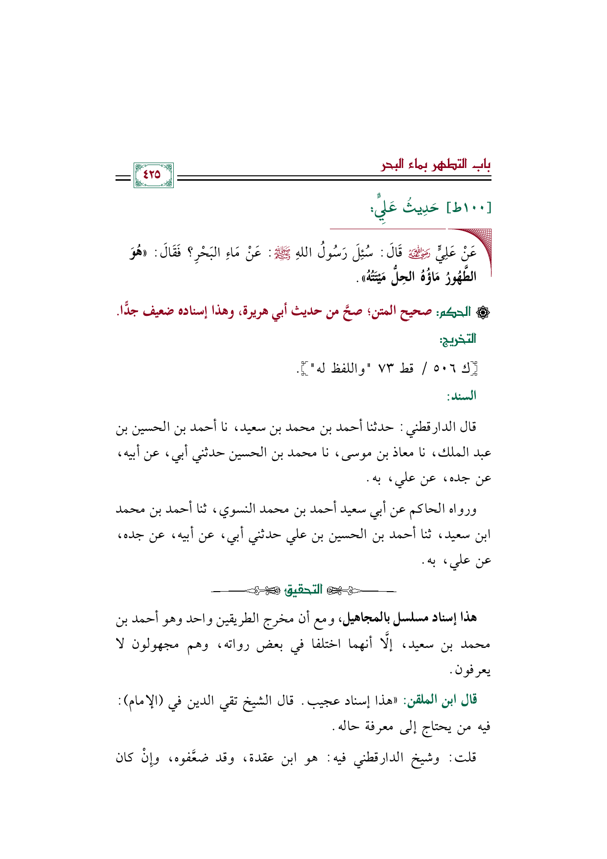 ◼ عَنْ عَلِيٍّ رضي الله عنه قَالَ: سُئِلَ رَسُولُ اللهِ صلى الله عليه وسلم: عَنْ مَاءِ البَحْرِ؟ فَقَالَ: ((هُوَ الطَّهُورُ مَاؤُهُ الحِلُّ مَيْتَتُهُ)).