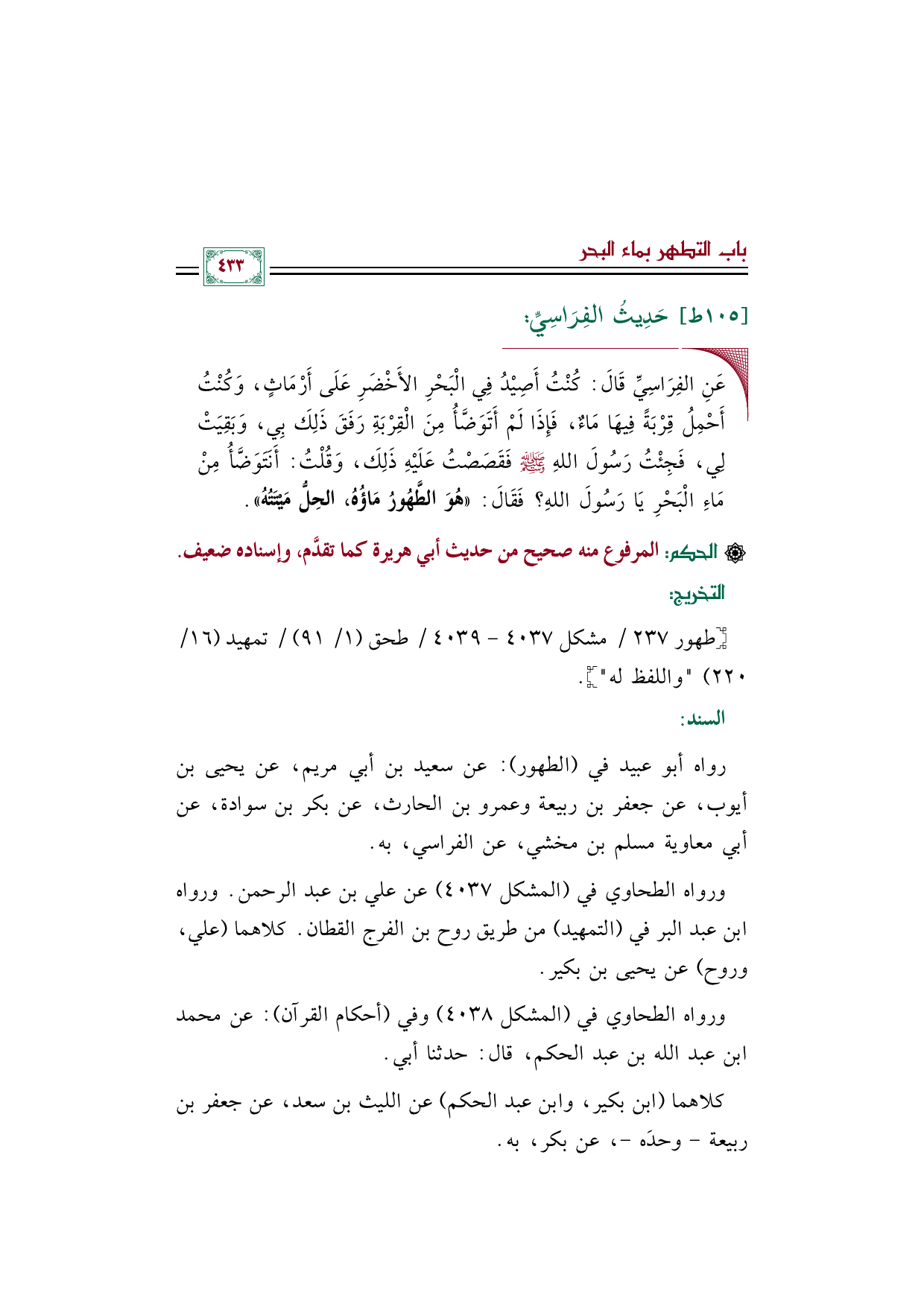 رواه أبو عبيد في (الطهور): عن سعيد بن أبي مريم، عن يحيى بن أيوب، عن جعفر بن ربيعة وعمرو بن الحارث، عن بكر بن سوادة، عن أبي معاوية مسلم بن مخشي، عن الفراسي، به.
