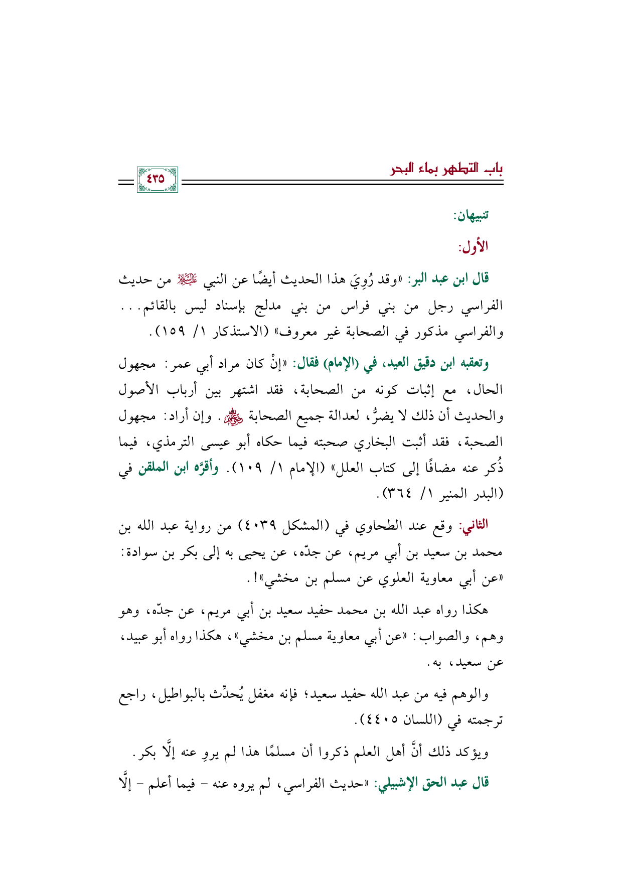 وتعقبه ابن دقيق العيد، في ((الإمام)) فقال: ((إنْ كان مراد أبي عمر: مجهول الحال، مع إثبات كونه من الصحابة، فقد اشتهر بين أرباب الأصول والحديث أن ذلك لا يضرُّ، لعدالة جميع الصحابة رضي الله عنهم. وإن أراد: مجهول الصحبة، فقد أثبت البخاري صحبته فيما حكاه أبو عيسى الترمذي، فيما ذُكر عنه مضافًا إلى كتاب العلل)) (الإمام ١/ ١٠٩). وأقرَّه ابن الملقن في (البدر المنير ١/ ٣٦٤).