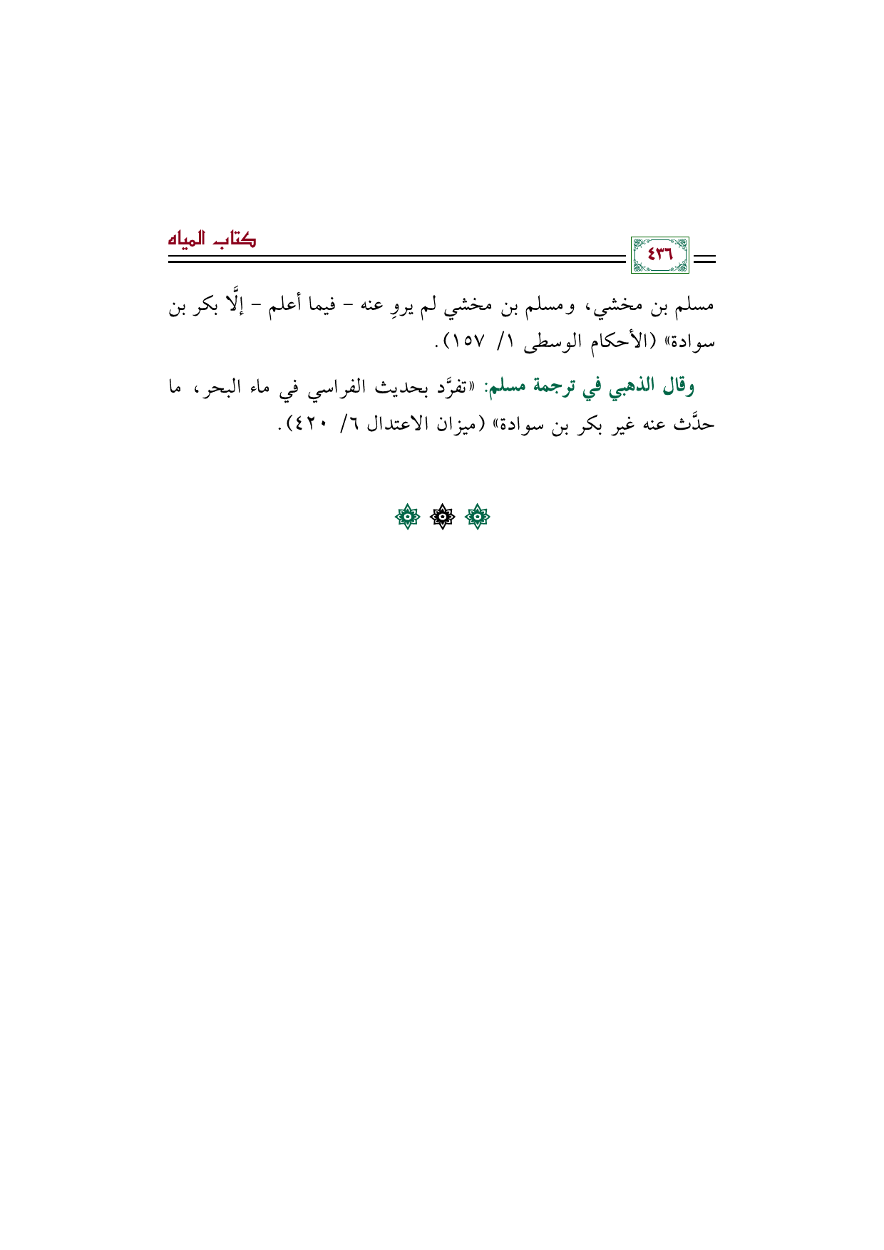 وقال الذهبي في ترجمة مسلم: ((تفرَّد بحديث الفراسي في ماء البحر، ما حدَّث عنه غير بكر بن سوادة)) (ميزان الاعتدال ٦/ ٤٢٠).