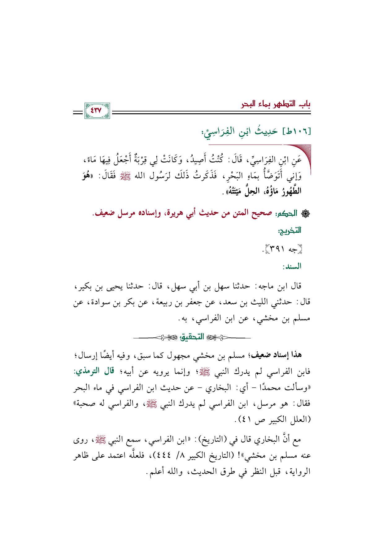هذا إسناد ضعيف؛ مسلم بن مخشي مجهول كما سبق، وفيه أيضًا إرسال؛ فابن الفراسي لم يدرك النبي صلى الله عليه وسلم؛ وإنما يرويه عن أبيه؛ قال الترمذي: ((وسألت محمدًا - أي: البخاري - عن حديث ابن الفراسي في ماء البحر فقال: هو مرسل، ابن الفراسي لم يدرك النبي صلى الله عليه وسلم، والفراسي له صحبة)) (العلل الكبير ص ٤١).