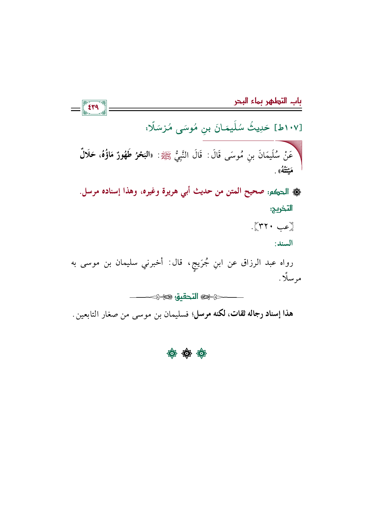 ◼ عَنْ سُلَيمَانَ بنِ مُوسَى قَالَ: قَالَ النَّبِيُّ صلى الله عليه وسلم: ((البَحْرُ طَهُورٌ مَاؤُهُ، حَلَالٌ مَيْتَتُهُ)).