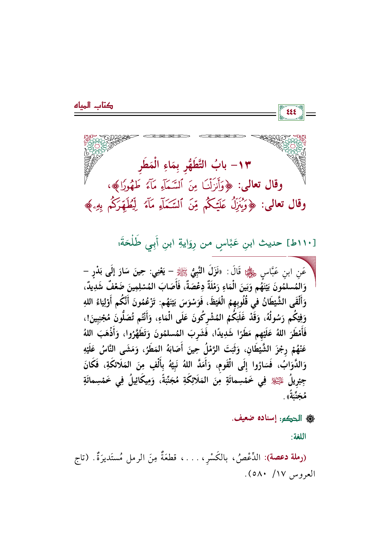 ◼ عَنِ ابنِ عَبَّاسٍ رضي الله عنهما قَالَ: ((نَزَلَ النَّبِيُّ صلى الله عليه وسلم - يَعْنِي: حِينَ سَارَ إلَى بَدْرٍ - وَالمُسلمُونَ بَيْنَهُم وَبَينَ الْمَاءِ رَمْلَةٌ دِعْصَةٌ، فَأَصَابَ المُسْلِمِينَ ضَعْفٌ شَدِيدٌ، وَأَلْقَى الشَّيْطَانُ في قُلُوبِهِمُ الْغَيْظَ، فَوَسْوَسَ بَيْنَهُم: تَزْعُمُونَ أَنَّكُم أَوْلِيَاءُ اللهِ وَفِيْكُم رَسُولُهُ، وَقَدْ غَلَبَكُمُ المُشْرِكُونَ عَلَى الْمَاءِ، وَأَنْتُم تُصَلُّونَ مُجْنِبِينَ! ، فَأَمْطَرَ اللهُ عَلَيْهِم مَطَرًا شَدِيدًا، فَشَرِبَ المُسلمُونَ وَتَطَهَّرُوا، وَأَذْهَبَ اللهُ عَنْهُمْ رِجْزَ الشَّيْطَانِ، وَثَبَتَ الرَّمْلُ حِينَ أَصَابَهُ المَطَرُ، وَمَشَى النَّاسُ عَلَيْهِ وَالدَّوَابُ، فَسَارُوا إِلَى الْقَومِ، وَأَمَدَّ اللهُ نَبِيَّهُ بِأَلْفٍ مِنَ المَلَائكَةِ، فَكَانَ جِبْرِيلُ عليه السلام فِي خَمْسِمائَةٍ مِنَ المَلَائِكَةِ مُجَنِّبَةً، وَمِيكَائِيلُ فِي خَمْسِمائَةٍ مُجَنِّبَةً)).