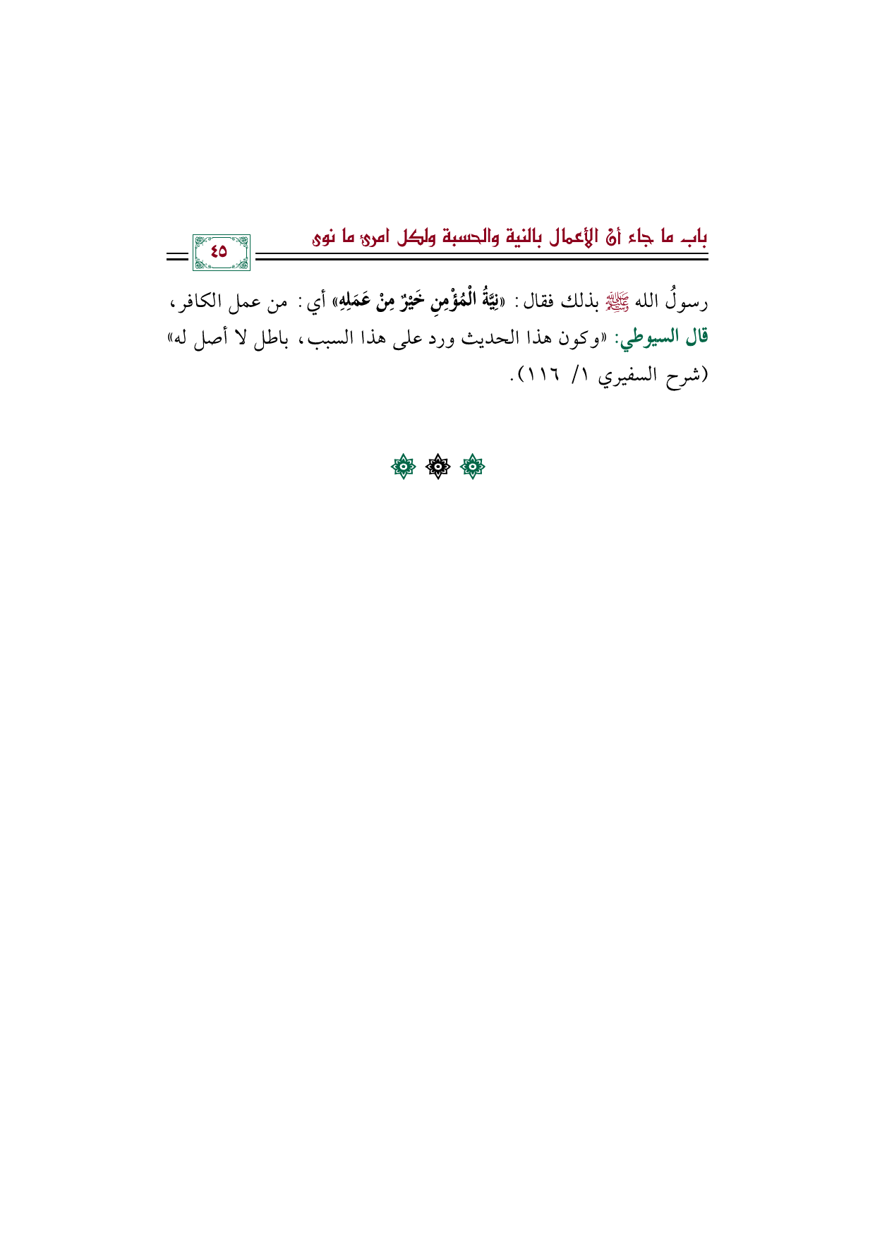 رسولُ الله صلى الله عليه وسلم بذلك فقال: «نِيَّةُ الْمُؤْمِنِ خَيْرٌ مِنْ عَمَلِهِ» أي: من عمل الكافر، قال السيوطي: «وكون هذا الحديث ورد على هذا السبب، باطل لا أصل له» (شرح السفيري ١/ ١١٦).