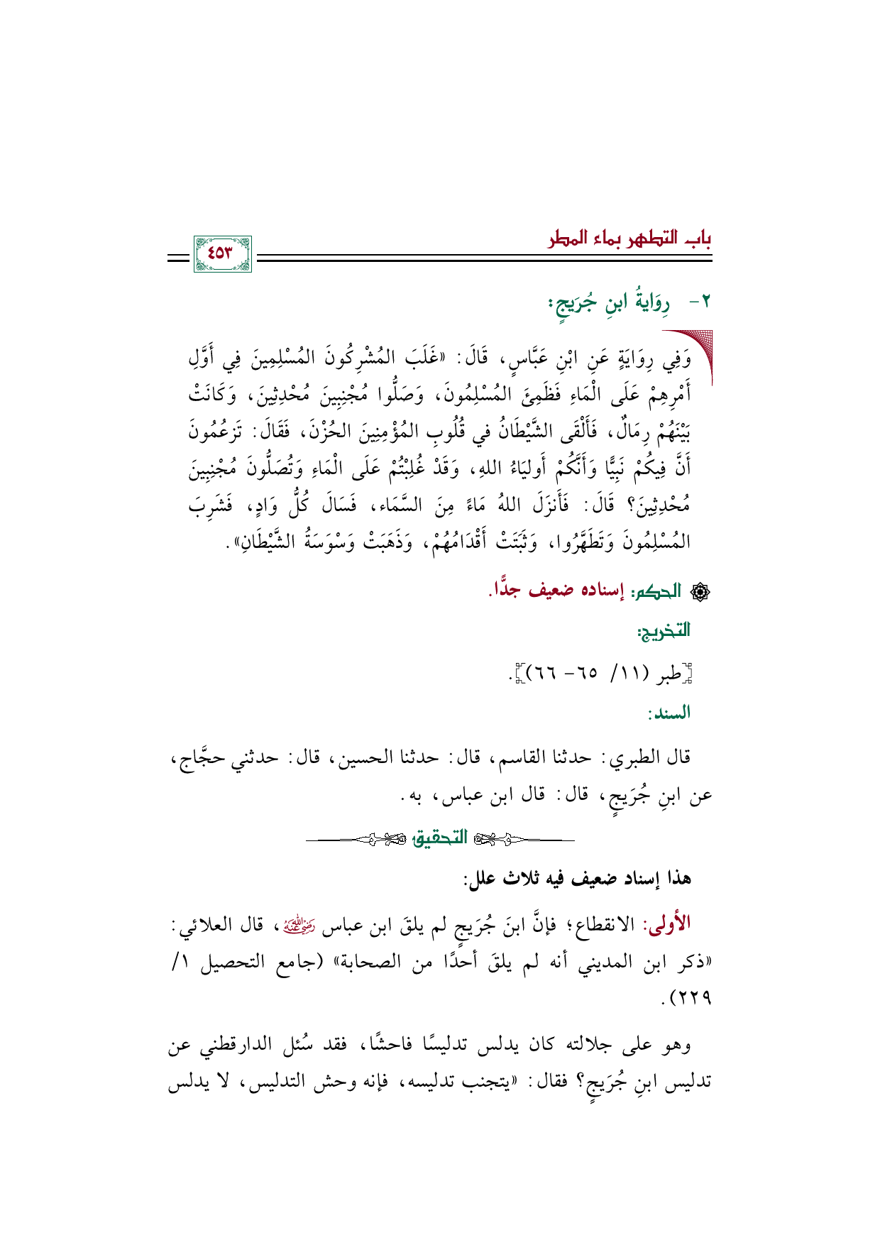 الأولى: الانقطاع؛ فإنَّ ابنَ جُرَيجٍ لم يلقَ ابن عباس رضي الله عنه، قال العلائي: ((ذكر ابن المديني أنه لم يلقَ أحدًا من الصحابة)) (جامع التحصيل ١/ ٢٢٩).