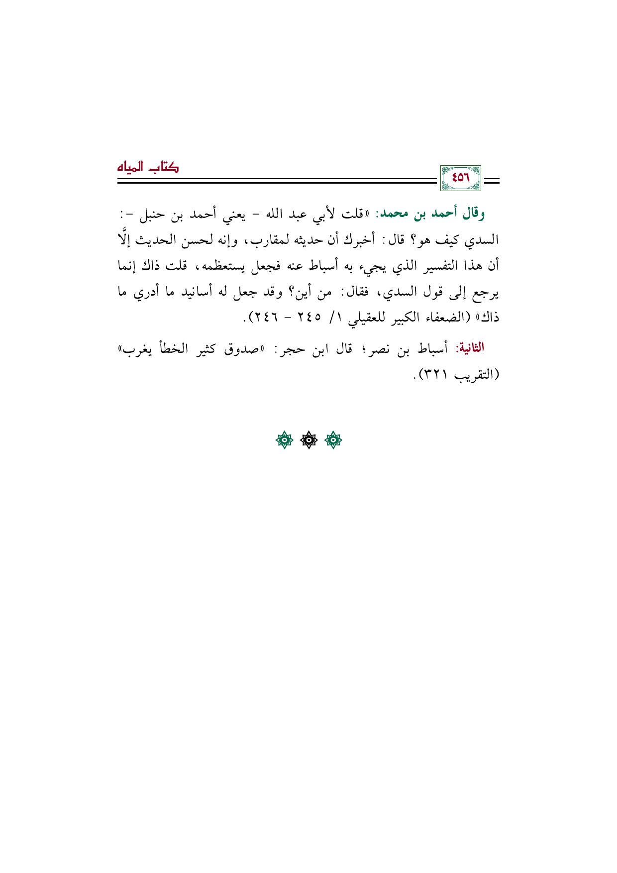 وقال أحمد بن محمد: ((قلت لأبي عبد الله - يعني أحمد بن حنبل -: السدي كيف هو؟ قال: أخبرك أن حديثه لمقارب، وإنه لحسن الحديث إلَّا أن هذا التفسير الذي يجيء به أسباط عنه فجعل يستعظمه، قلت ذاك إنما يرجع إلى قول السدي، فقال: من أين؟ وقد جعل له أسانيد ما أدري ما ذاك)) (الضعفاء الكبير للعقيلي ١/ ٢٤٥ - ٢٤٦).