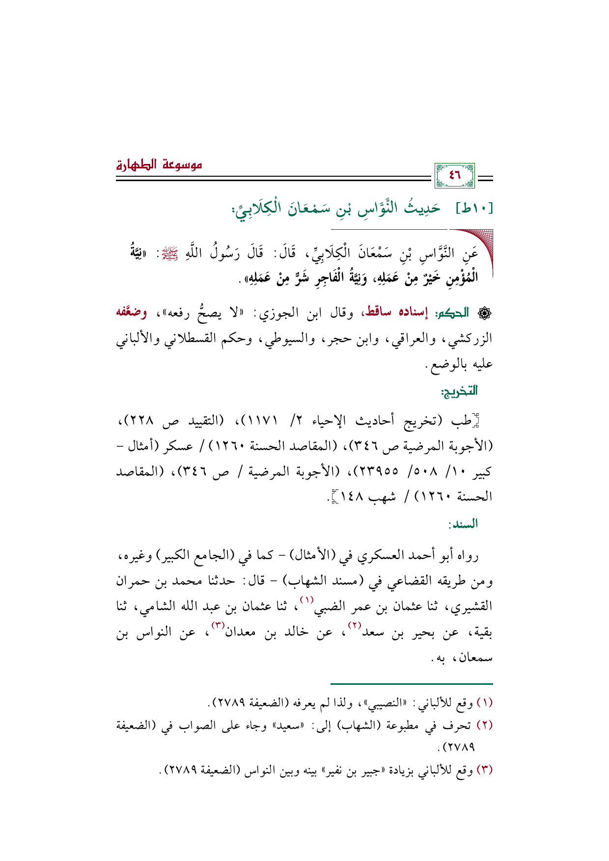 (¬٣) - وقع للألباني بزيادة «جبير بن نفير» بينه وبين النواس (الضعيفة ٢٧٨٩).
