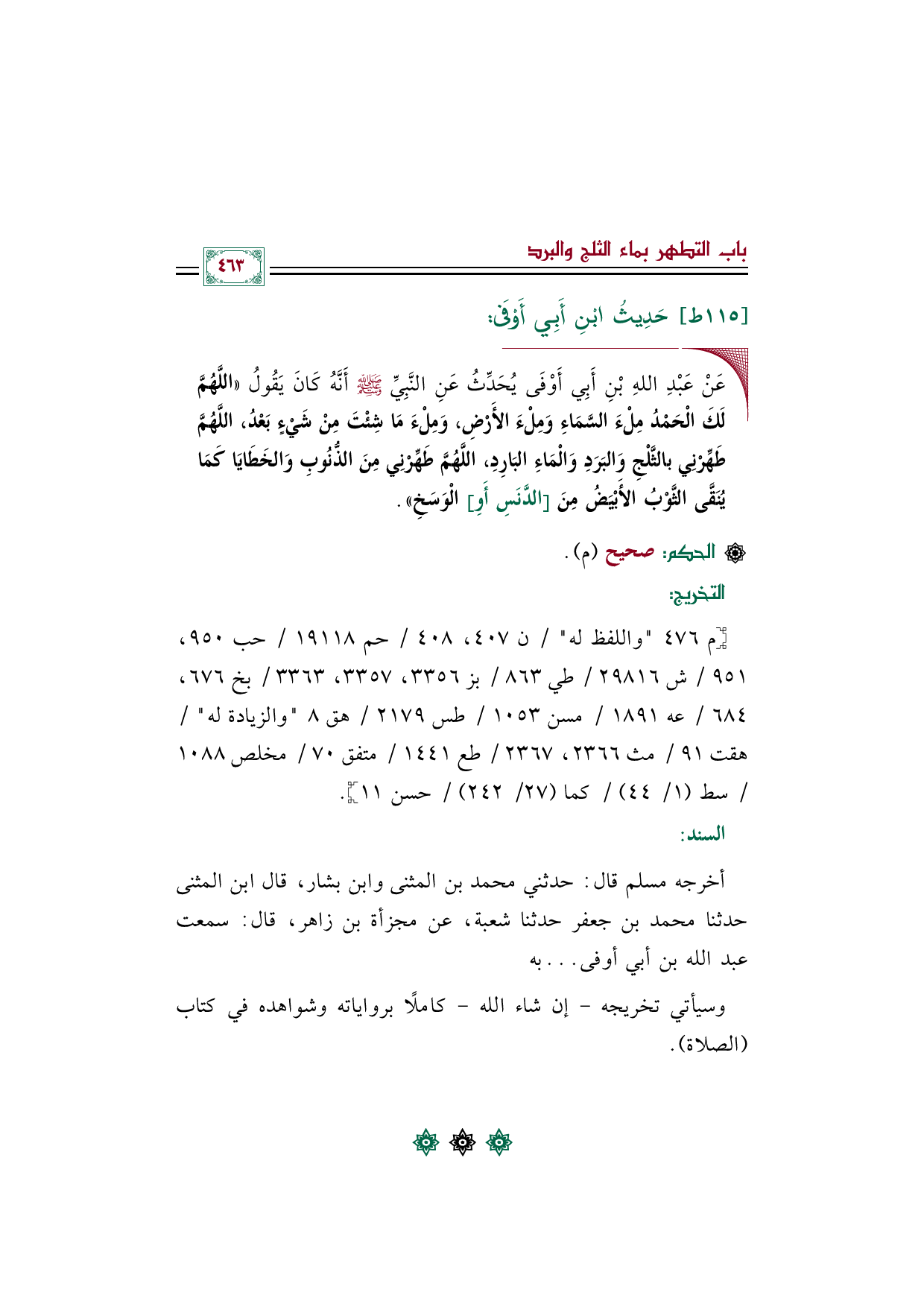 ◼ عَنْ عَبْدِ اللهِ بْنِ أَبِي أَوْفَى يُحَدِّثُ عَنِ النَّبِيِّ صلى الله عليه وسلم أَنَّهُ كَانَ يَقُولُ ((اللَّهُمَّ لَكَ الْحَمْدُ مِلْءَ السَّمَاءِ وَمِلْءَ الأَرْضِ، وَمِلْءَ مَا شِئْتَ مِنْ شَيْءٍ بَعْدُ، اللَّهُمَّ طَهِّرْنِي بالثَّلْجِ وَالبَرَدِ وَالْمَاءِ البَارِدِ، اللَّهُمَّ طَهِّرْنِي مِنَ الذُّنُوبِ وَالخَطَايَا كَمَا يُنَقَّى الثَّوْبُ الأَبْيَضُ مِنَ [الدَّنَسِ أَوِ] الْوَسَخِ)).