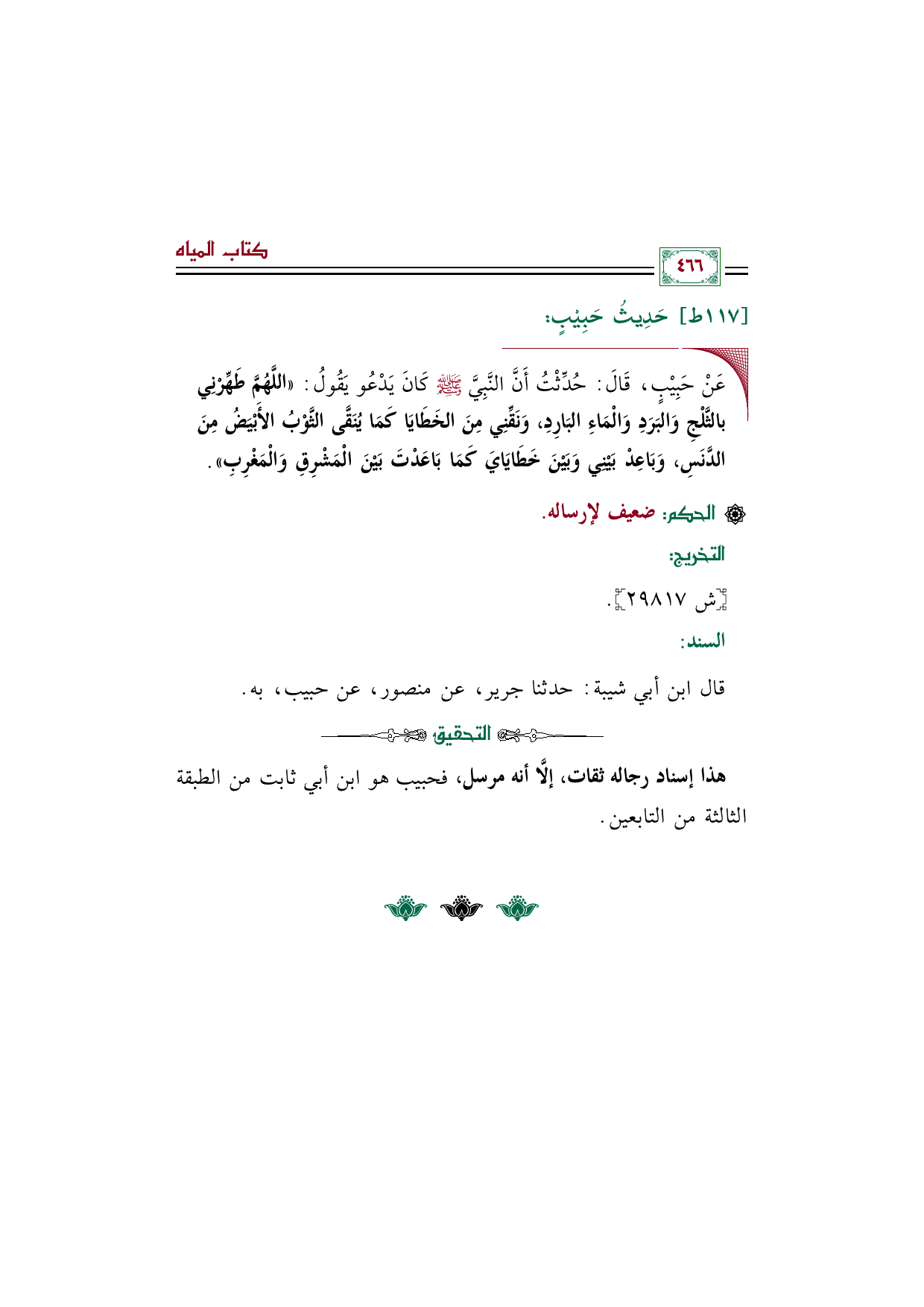 ◼ عَنْ حَبِيْبٍ، قَالَ: حُدِّثْتُ أَنَّ النَّبِيَّ صلى الله عليه وسلم كَانَ يَدْعُو يَقُولُ: ((اللَّهُمَّ طَهِّرْنِي بالثَّلْجِ وَالبَرَدِ وَالْمَاءِ البَارِدِ، وَنَقِّنِي مِنَ الخَطَايَا كَمَا يُنَقَّى الثَّوْبُ الأَبْيَضُ مِنَ الدَّنَسِ، وَبَاعِدْ بَيْنِي وَبَيْنَ خَطَايَايَ كَمَا بَاعَدْتَ بَيْنَ الْمَشْرِقِ وَالْمَغْرِبِ)).