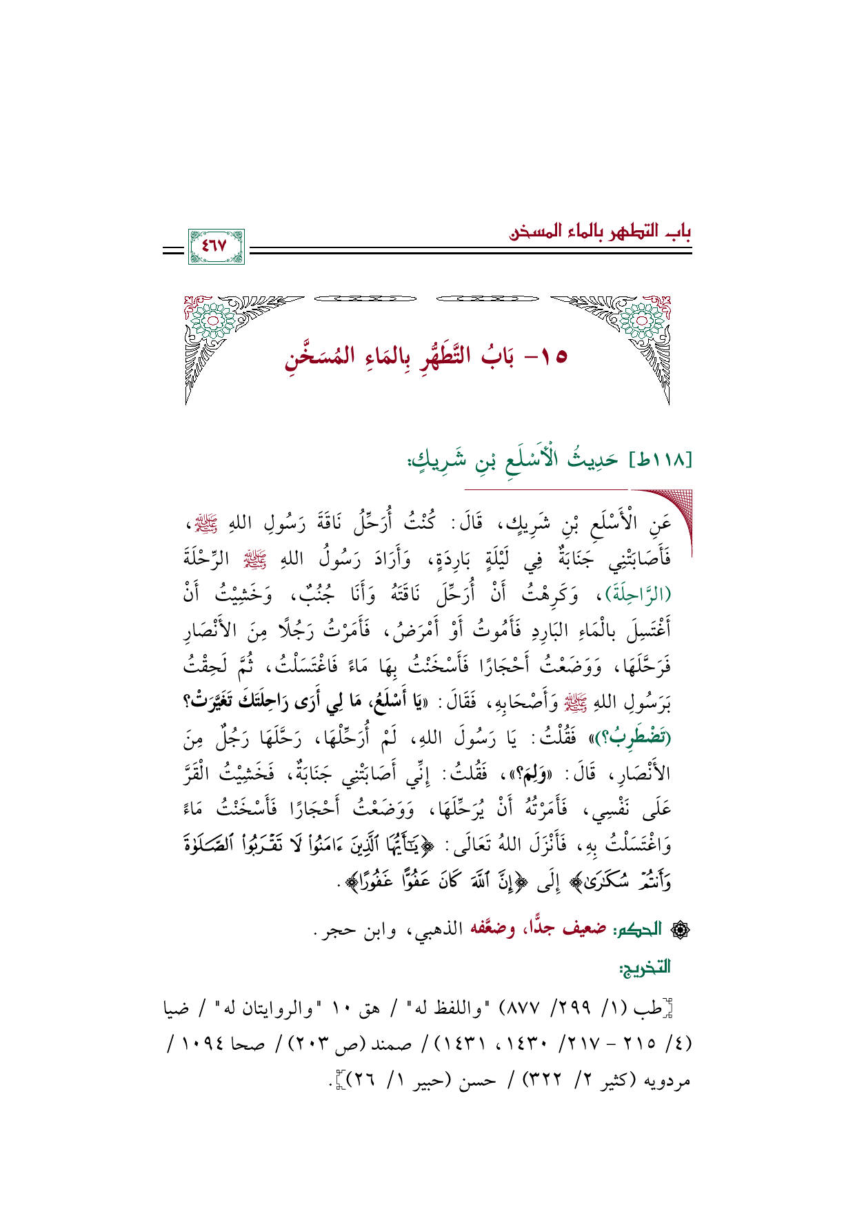 ◼ عَنِ الْأَسْلَعِ بْنِ شَرِيكٍ، قَالَ: كُنْتُ أُرَحِّلُ نَاقَةَ رَسُولِ اللهِ صلى الله عليه وسلم، فَأَصَابَتْنِي جَنَابَةٌ فِي لَيْلَةٍ بَارِدَةٍ، وَأَرَادَ رَسُولُ اللهِ صلى الله عليه وسلم الرِّحْلَةَ (الرَّاحِلَةَ)، وَكَرِهْتُ أَنْ أُرَحِّلَ نَاقَتَهُ وَأَنَا جُنُبٌ، وَخَشِيْتُ أَنْ أَغْتَسِلَ بالْمَاءِ البَارِدِ فَأَمُوتُ أَوْ أَمْرَضُ، فَأَمَرْتُ رَجُلًا مِنَ الأَنْصَارِ فَرَحَّلَهَا، وَوَضَعْتُ أَحْجَارًا فَأَسْخَنْتُ بِهَا مَاءً فَاغْتَسَلْتُ، ثُمَّ لَحِقْتُ بَرَسُولِ اللهِ صلى الله عليه وسلم وَأَصْحَابِهِ، فَقَالَ: ((يَا أَسْلَعُ، مَا لِي أَرَى رَاحِلَتَكَ تَغَيَّرَتْ؟ (تَضْطَرِبُ؟ ))) فَقُلْتُ: يَا رَسُولَ اللهِ، لَمْ أُرَحِّلْهَا، رَحَّلَهَا رَجُلٌ مِنَ الأَنْصَارِ، قَالَ: ((وَلِمَ؟ ))، فَقُلتُ: إِنِّي أَصَابَتْنِي جَنَابَةٌ، فَخَشِيْتُ الْقَرَّ عَلَى نَفْسِي، فَأَمَرْتُهُ أَنْ يُرَحِّلَهَا، وَوَضَعْتُ أَحْجَارًا فَأَسْخَنْتُ مَاءً وَاغْتَسَلْتُ بِهِ، فَأَنْزَلَ اللهُ تَعَالَى: {يَا أَيها الذينَ آمَنُوا لَا تَقرَبُوا الصلَاةَ وَأَنتُم سُكَارَى} إِلَى {إن اللهَ كَانَ عَفُوا غَفُورًا}.
