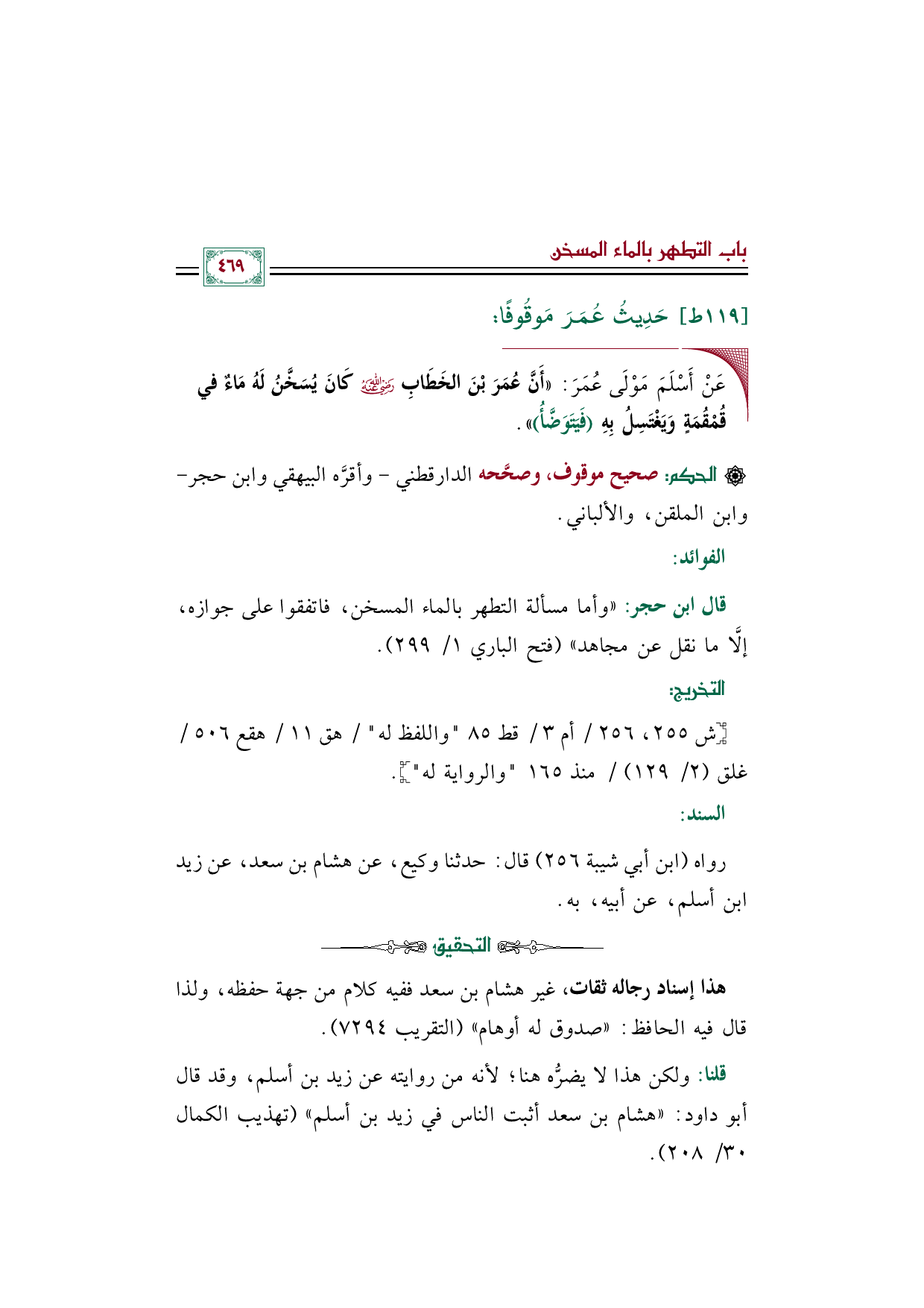 قلنا: ولكن هذا لا يضرُّه هنا؛ لأنه من روايته عن زيد بن أسلم، وقد قال أبو داود: ((هشام بن سعد أثبت الناس في زيد بن أسلم)) (تهذيب الكمال ٣٠/ ٢٠٨).