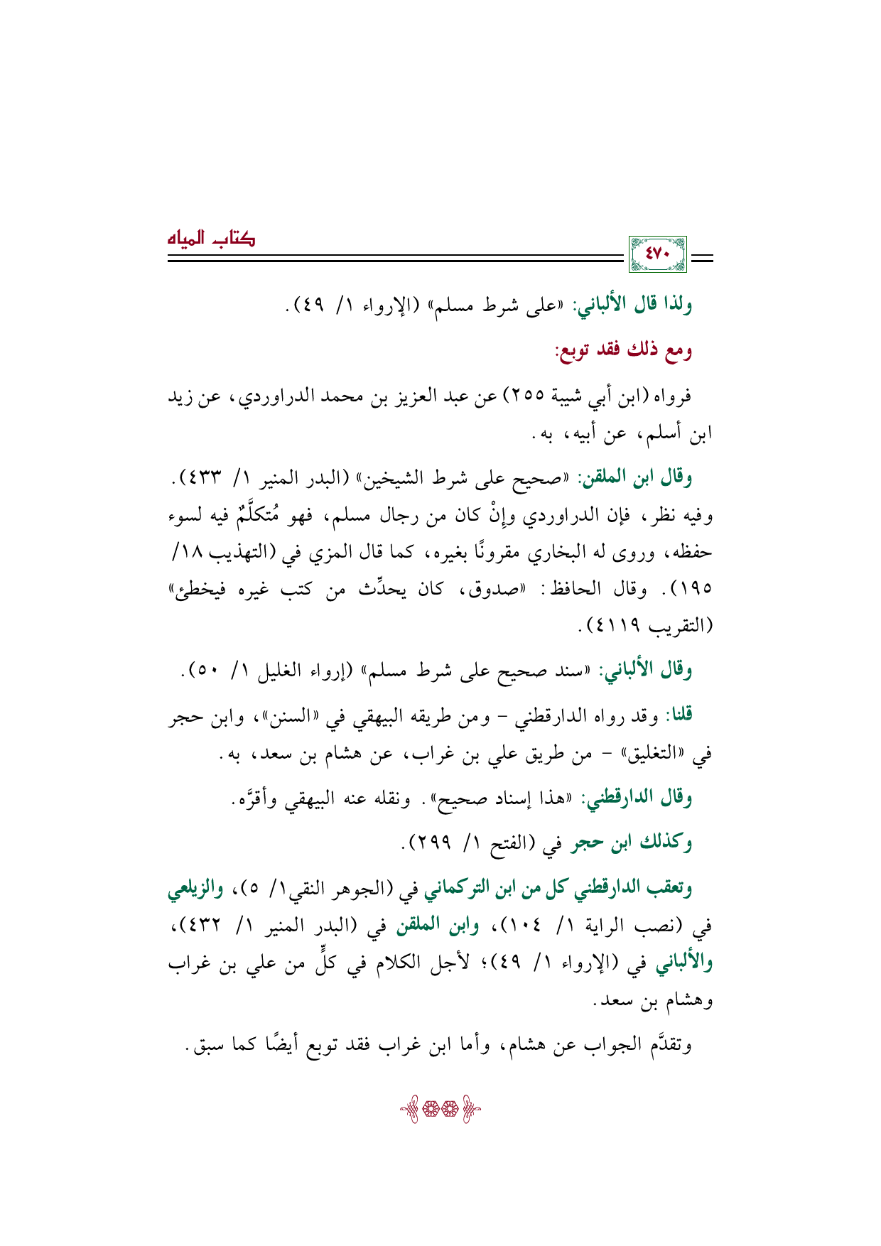 وتعقب الدارقطني كل من ابن التركماني في (الجوهر النقي ١/ ٥)، والزيلعي في (نصب الراية ١/ ١٠٤)، وابن الملقن في (البدر المنير ١/ ٤٣٢)، والألباني في (الإرواء ١/ ٤٩)؛ لأجل الكلام في كلٍّ من علي بن غراب وهشام بن سعد.