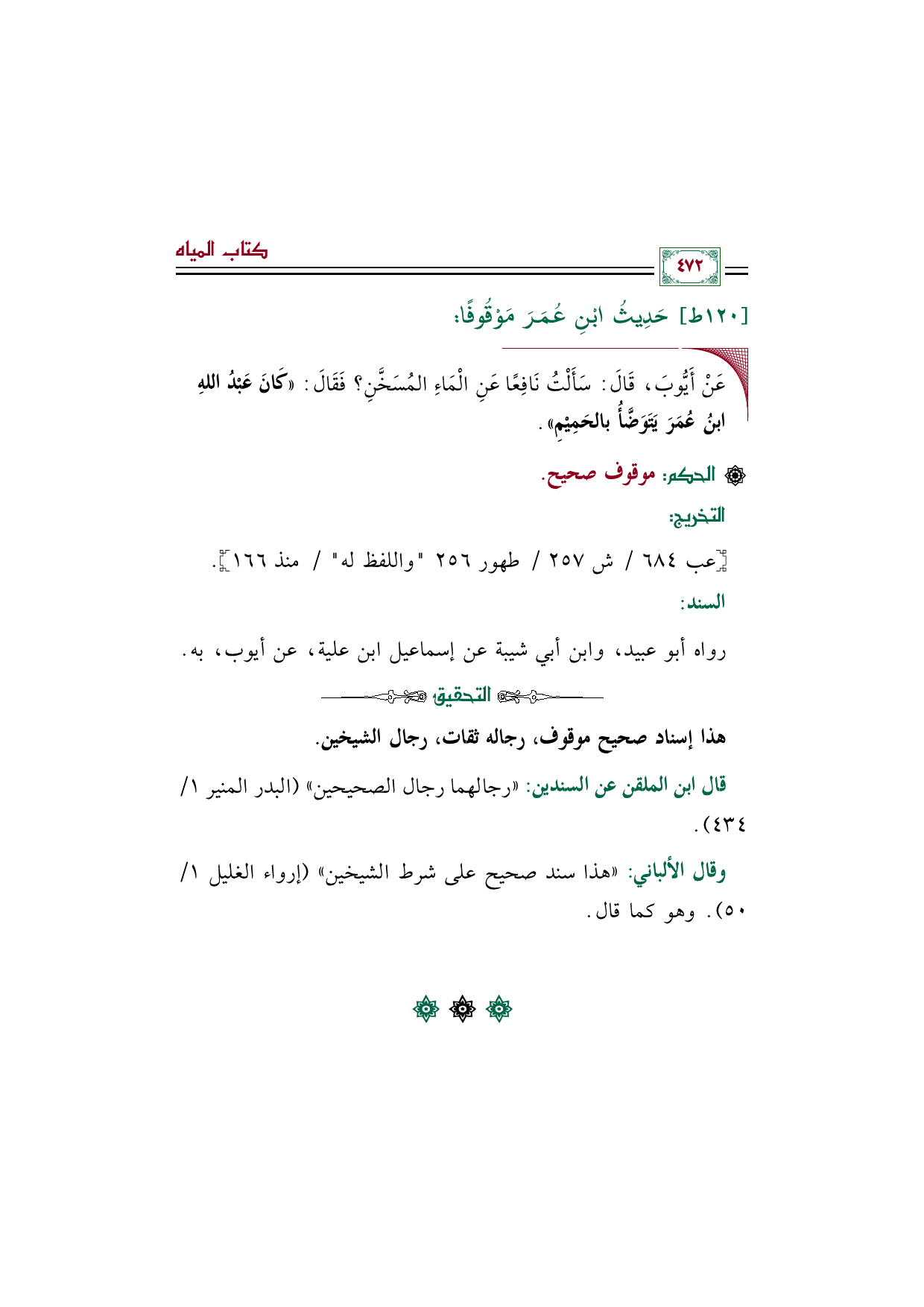 وقال الألباني: ((هذا سند صحيح على شرط الشيخين)) (إرواء الغليل ١/ ٥٠). وهو كما قال.