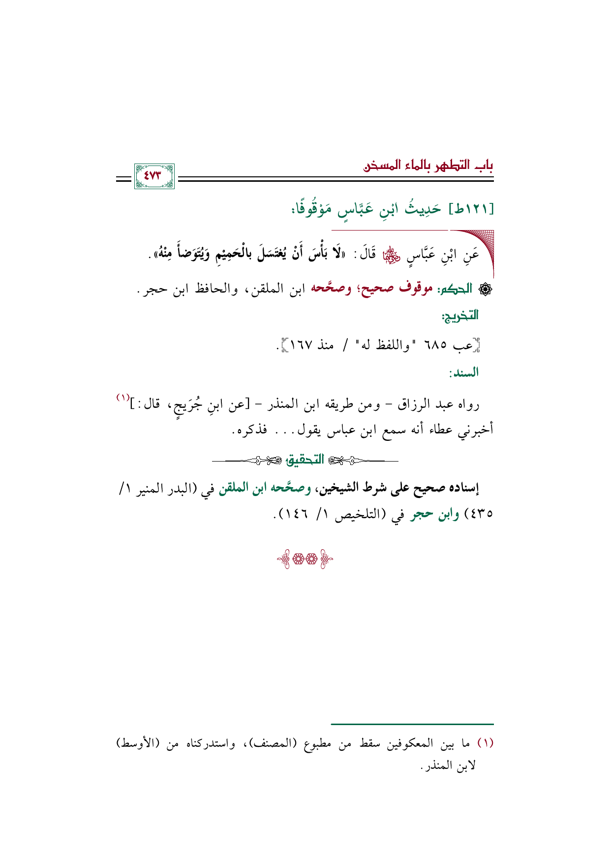 [الحكم]: موقوف صحيح؛ وصحَّحه ابن الملقن، والحافظ ابن حجر.