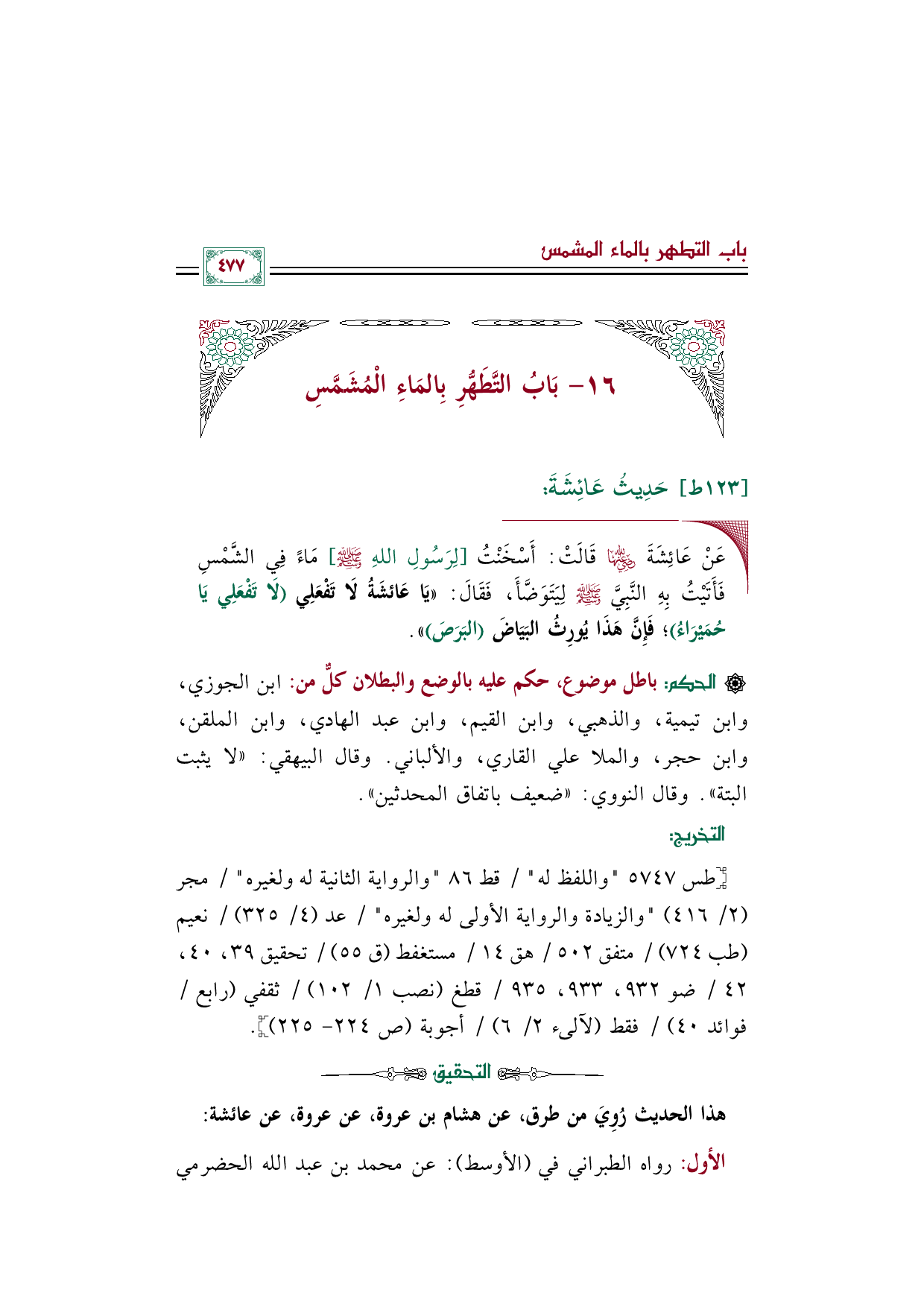 ◼ عَنْ عَائِشَةَ رضي الله عنها قَالَتْ: أَسْخَنْتُ [لِرَسُولِ اللهِ صلى الله عليه وسلم] مَاءً فِي الشَّمْسِ فَأَتَيْتُ بِهِ النَّبِيَّ صلى الله عليه وسلم لِيَتَوَضَّأَ، فَقَالَ: ((يَا عَائشَةُ لَا تَفْعَلِي (لَا تَفْعَلِي يَا حُمَيْرَاءُ)؛ فَإِنَّ هَذَا يُورِثُ البَيَاضَ (البَرَصَ))).