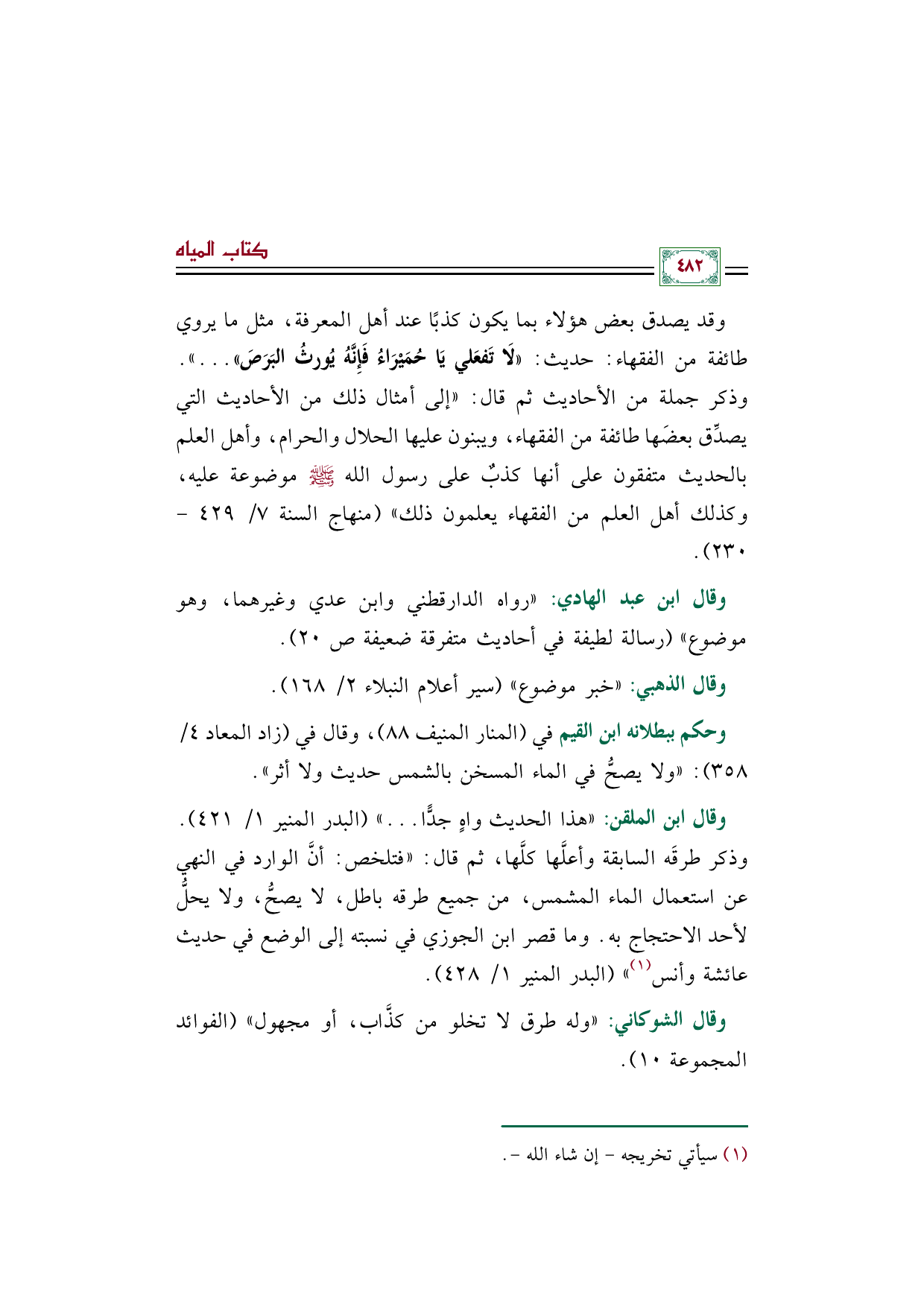 وقد يصدق بعض هؤلاء بما يكون كذبًا عند أهل المعرفة، مثل ما يروي طائفة من الفقهاء: حديث: ((لَا تَفعَلي يَا حُمَيْرَاءُ فَإِنَّهُ يُورثُ البَرَصَ)) .... )). وذكر جملة من الأحاديث ثم قال: ((إلى أمثال ذلك من الأحاديث التي يصدِّق بعضَها طائفة من الفقهاء، ويبنون عليها الحلال والحرام، وأهل العلم بالحديث متفقون على أنها كذبٌ على رسول الله صلى الله عليه وسلم موضوعة عليه، وكذلك أهل العلم من الفقهاء يعلمون ذلك)) (منهاج السنة ٧/ ٤٢٩ - ٢٣٠).