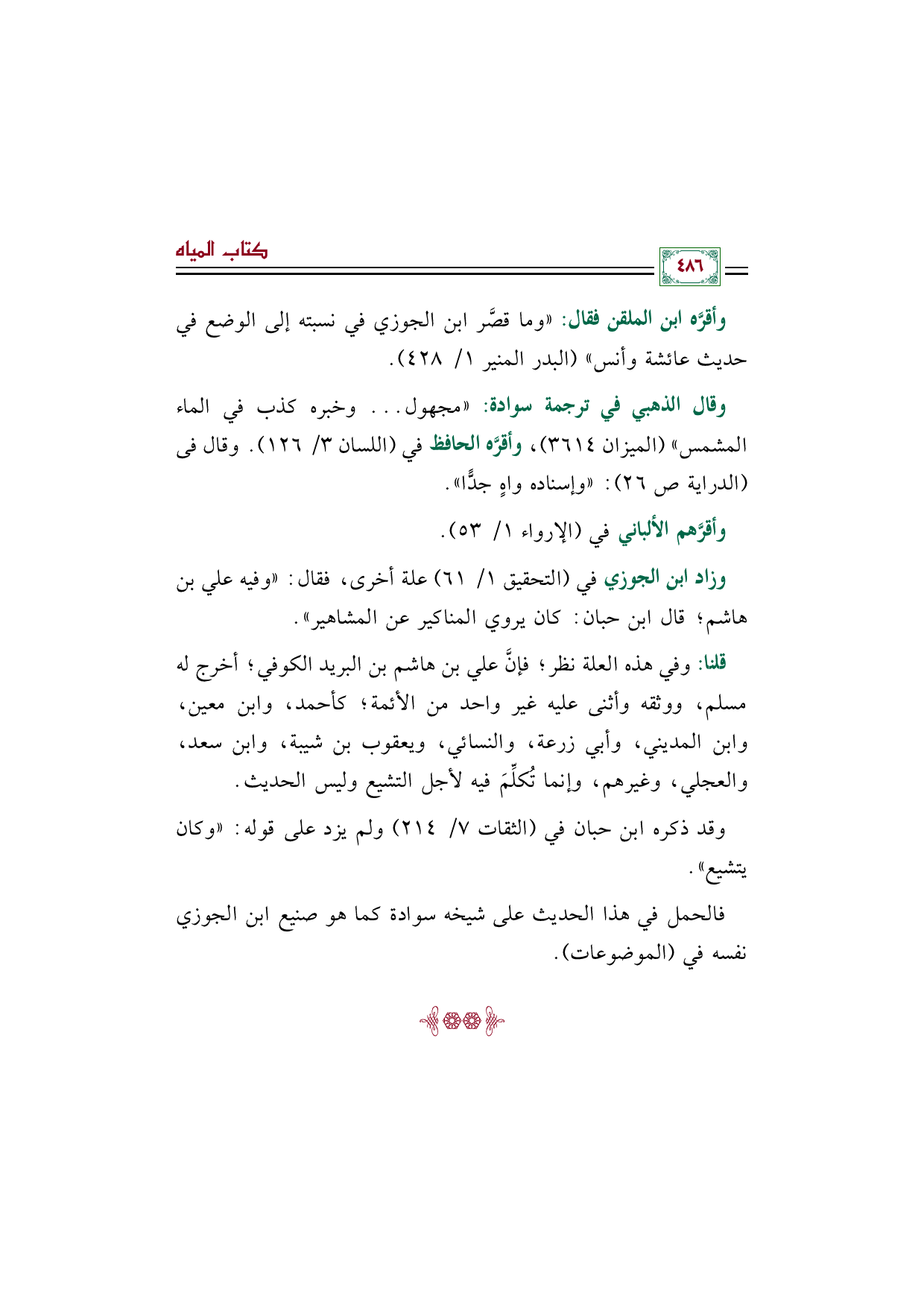 قلنا: وفي هذه العلة نظر؛ فإنَّ علي بن هاشم بن البريد الكوفي؛ أخرج له مسلم، ووثقه وأثنى عليه غير واحد من الأئمة؛ كأحمد، وابن معين، وابن المديني، وأبي زرعة، والنسائي، ويعقوب بن شيبة، وابن سعد، والعجلي، وغيرهم، وإنما تُكلِّمَ فيه لأجل التشيع وليس الحديث.
