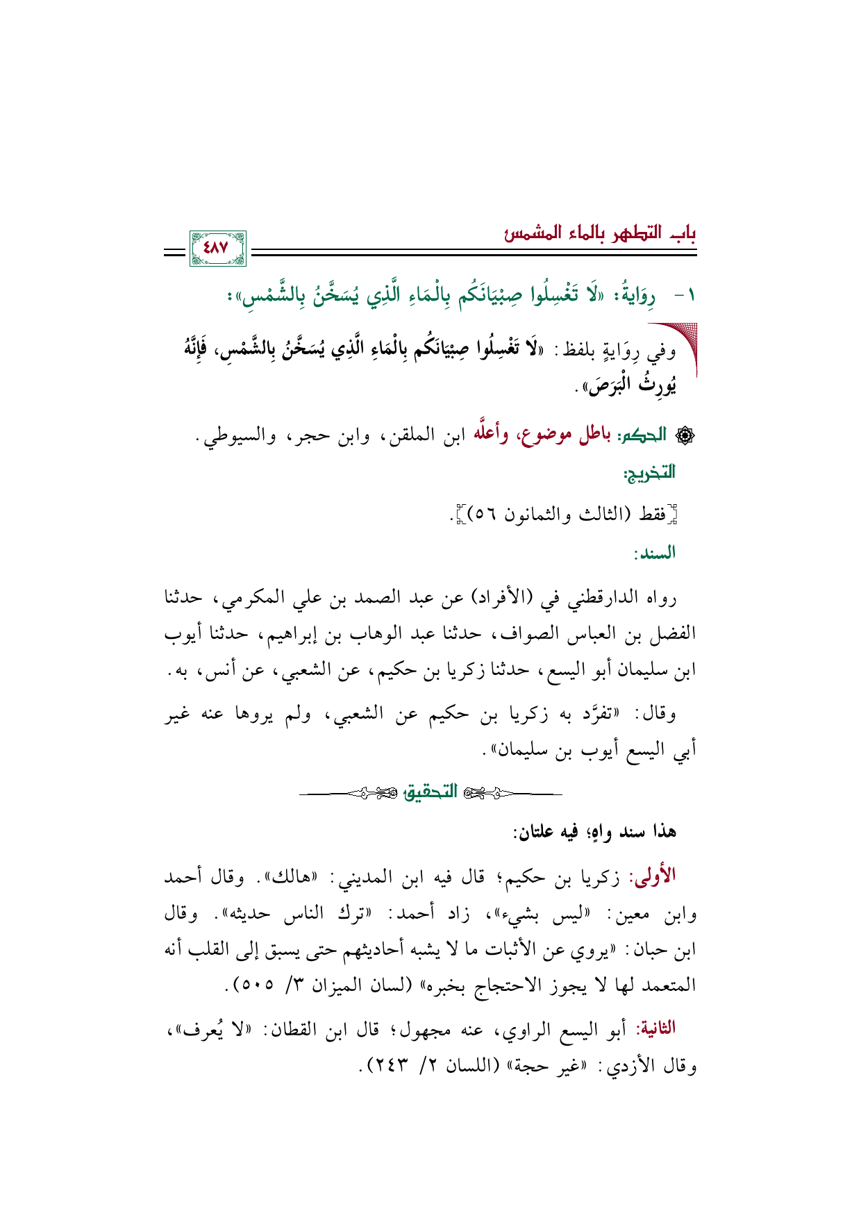 الثانية: أبو اليسع الراوي، عنه مجهول؛ قال ابن القطان: ((لا يُعرف))، وقال الأزدي: ((غير حجة)) (اللسان ٢/ ٢٤٣).
