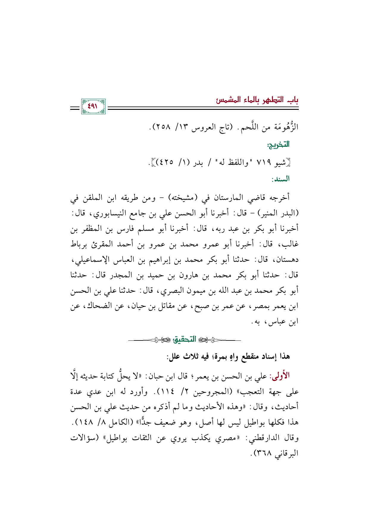 أخرجه (قاضي المارستان) في ((مشيخته)) - ومن طريقه (ابن الملقن) في ((البدر المنير)) - قال: أخبرنا أبو الحسن علي بن جامع النيسابوري، قال: أخبرنا أبو بكر بن عبد ربه، قال: أخبرنا أبو مسلم فارس بن المظفر بن غالب، قال: أخبرنا أبو عمرو محمد بن عمرو بن أحمد المقرئ برباط دهستان، قال: حدثنا أبو بكر محمد بن إبراهيم بن العباس الإسماعيلي، قال: حدثنا أبو بكر محمد بن هارون بن حميد بن المجدر قال: حدثنا أبو بكر محمد بن عبد الله بن ميمون البصري، قال: حدثنا علي بن الحسن بن يعمر بمصر، عن عمر بن صبح، عن مقاتل بن حيان، عن الضحاك، عن ابن عباس، به.