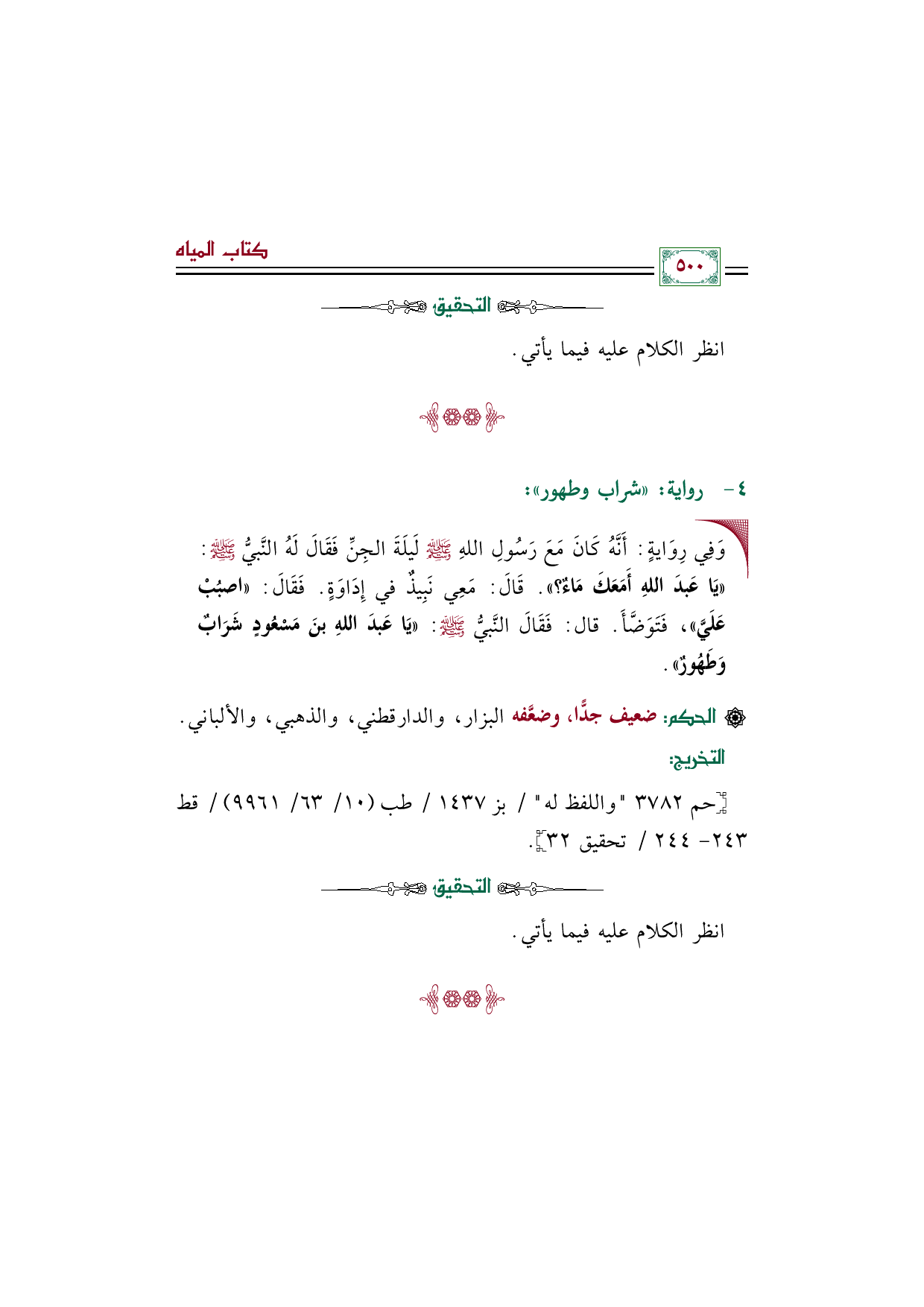 قَالَ: فَقَالَ النَّبيُّ صلى الله عليه وسلم: ((يَا عَبدَ اللهِ بنَ مَسْعُودٍ شَرَابٌ وَطَهُورٌ)).