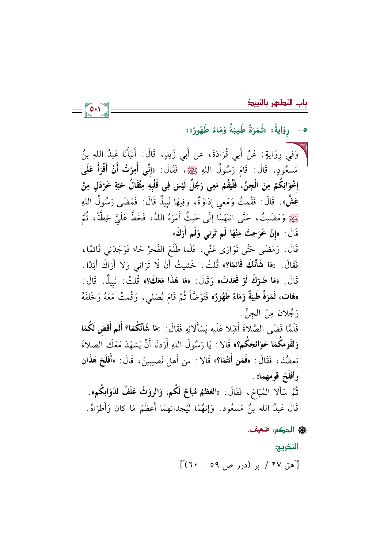 • وَفِي رِوَايةٍ: عَنْ أَبي قُرَادَةَ، عن أَبي زَيدٍ، قَالَ: أَنبَأَنَا عَبدُ اللهِ بنُ مَسعُودٍ، قَالَ: قَامَ رَسُولُ اللهِ صلى الله عليه وسلم، فَقَالَ: ((إِنِّي أُمِرْتُ أَنْ أَقْرَأَ عَلَى إِخْوَانِكُمْ مِنَ الْجِنِّ، فَلْيَقُمْ مَعِي رَجُلٌ لَيْسَ فِي قَلْبِهِ مِثْقَالُ حَبَّةِ خَرْدَلٍ مِنْ غِشٍّ)) قَالَ: فَقُمتُ وَمَعي إِدَاوَةٌ، وفِيهَا نَبِيذٌ قَالَ: فَمَضَى رَسُولُ اللهِ صلى الله عليه وسلم وَمَضَيتُ، حَتَّى انتَهَينَا إلَى حَيثُ أَمَرَهُ اللهُ، فَخَطَّ عَلَيَّ خِطَّةً، ثُمَّ قَالَ: ((إِنْ خَرَجتَ مِنْهَا لَم تَرَني وَلَم أَرَكَ)). قَالَ: وَمَضَى حَتَّى تَوَارَى عَنِّي، فَلَما طَلَعَ الفَجرُ جَاءَ فَوَجَدَني قَائمًا، فَقَالَ: ((مَا شَأنُكَ قَائمًا؟)) قُلتُ: خَشيتُ أَنْ لَا تَرَاني وَلا أَرَاكَ أَبَدًا. قَالَ: ((مَا ضَرّكَ لَوْ قَعَدتَ)) وَقَالَ: ((مَا هَذَا مَعَكَ؟)) قُلتُ: نَبِيذٌ. قَالَ: ((هَات، ثَمَرَةٌ طَيبَةٌ وَمَاءٌ طَهُورٌ)) فَتَوَضَّأَ ثُمَّ قَامَ يُصَلي، وَقُمتُ مَعَهُ وَخَلفَهُ رَجُلان مِنَ الجِنِّ. فَلَمَّا قَضَى الصَّلاةَ أَقبَلا عَلَيه يَسْأَلَانِهِ فَقَالَ: ((مَا شَأنُكُمَا؟ أَلَم أَقضِ لَكُمَا وَلقَومكُمَا حَوَائجَكُم؟)) قَالا: يَا رَسُولَ اللهِ أَرَدنَا أَنْ يَشهَدَ مَعَكَ الصلاةَ بَعضُنَا، فَقَالَ: ((فَمَن أَنتُمَا؟)) قَالا: من أَهل نَصيبينَ، قَالَ: ((أَفلَحَ هَذَان وأفلَحَ قومهما)). ثُمَّ سَأَلا المُبَاحَ، فَقَالَ: ((العَظمُ مُبَاحٌ لَكُم، وَالروَثُ عَلَفٌ لدَوَابكُم)). قَالَ عَبدُ الله بنُ مَسعُود: وَإنهُمَا لَيَجدانهمَا أَعظَمَ مَا كان وَأَطرَاهُ.