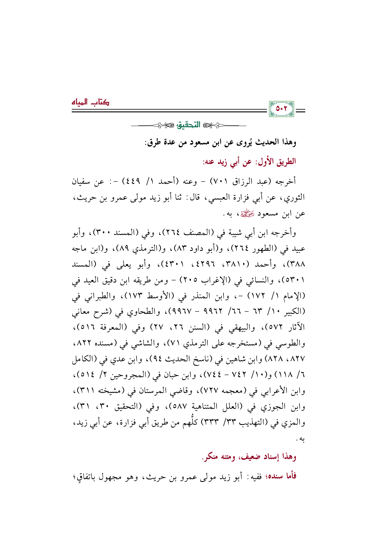 وأخرجه ابن أبي شيبة في (المصنف ٢٦٤)، وفي (المسند ٣٠٠)، وأبو عبيد في (الطهور ٢٦٤)، و (أبو داود ٨٣)، و (الترمذي ٨٩)، و (ابن ماجه ٣٨٨)، وأحمد (٣٨١٠، ٤٢٩٦، ٤٣٠١)، وأبو يعلى في (المسند ٥٣٠١)، والنسائي في (الإغراب ٢٠٥) - ومن طريقه ابن دقيق العيد في (الإمام ١/ ١٧٢) -، وابن المنذر في (الأوسط ١٧٣)، والطبراني في (الكبير ١٠/ ٦٣ - ٦٦/ ٩٩٦٢ - ٩٩٦٧)، والطحاوي في (شرح معاني الآثار ٥٧٢)، والبيهقي في (السنن ٢٦، ٢٧) وفي (المعرفة ٥١٦)، والطوسي في (مستخرجه على الترمذي ٧١)، والشاشي في (مسنده ٨٢٢، ٨٢٧، ٨٢٨) وابن شاهين في (ناسخ الحديث ٩٤)، وابن عدي في (الكامل ٦/ ١١٨) و (١٠/ ٧٤٢ - ٧٤٤)، وابن حبان في (المجروحين ٢/ ٥١٤)، وابن الأعرابي في (معجمه ٧٢٧)، وقاضي المرستان في (مشيخته ٣١١)، وابن الجوزي في (العلل المتناهية ٥٨٧)، وفي (التحقيق ٣٠، ٣١)، والمزي في (التهذيب ٣٣/ ٣٣٣) كلُّهم من طريق أبي فزارة، عن أبي زيد، به.
