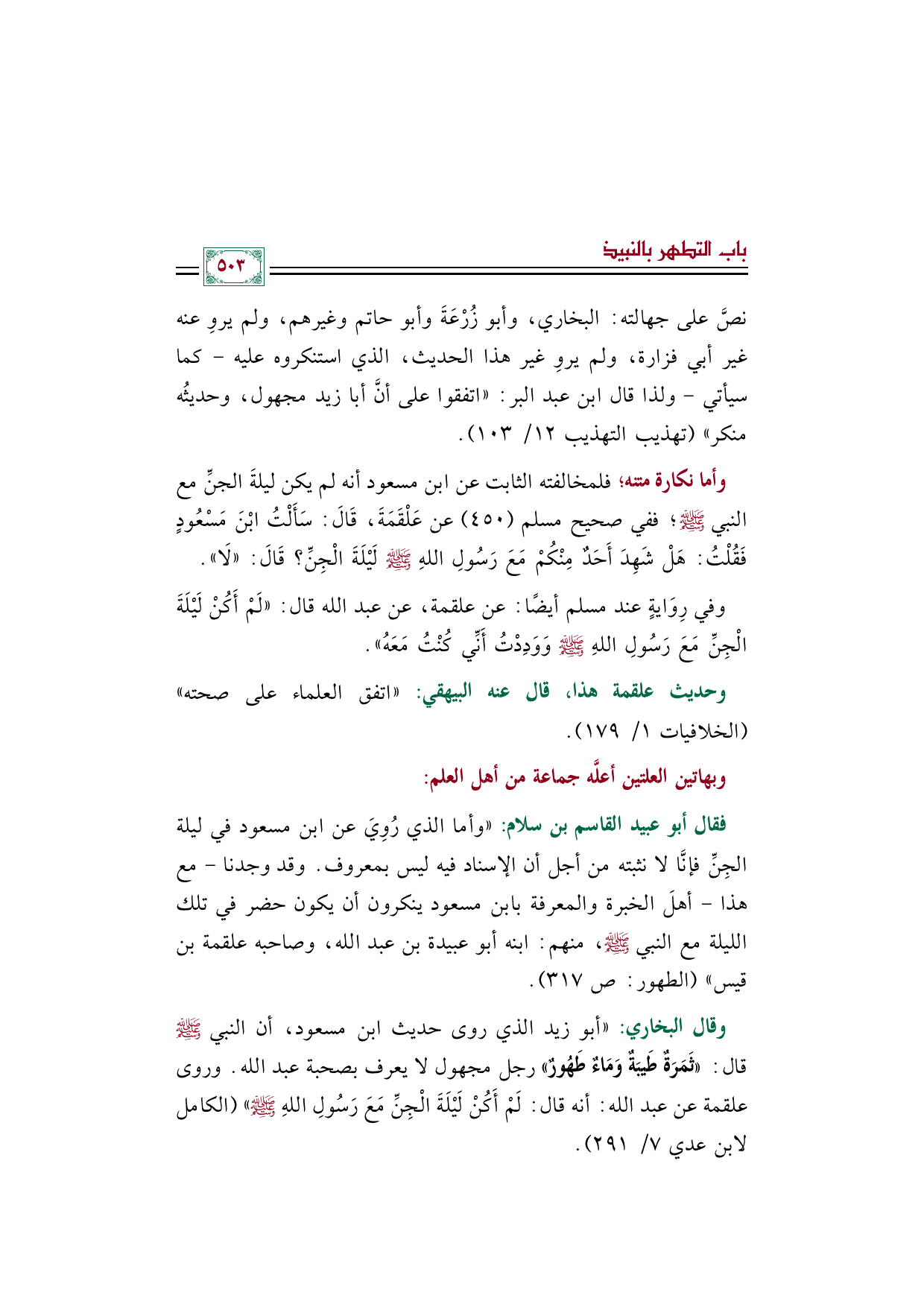 وقال البخاري: ((أبو زيد الذي روى حديث ابن مسعود، أن النبي صلى الله عليه وسلم قال: ((ثَمَرَةٌ طَيبَةٌ وَمَاءٌ طَهُورٌ)) رجل مجهول لا يعرف بصحبة عبد الله. وروى علقمة عن عبد الله: أنه قال: لَمْ أَكُنْ لَيْلَةَ الْجِنِّ مَعَ رَسُولِ اللهِ صلى الله عليه وسلم)) (الكامل لابن عدي ٧/ ٢٩١).