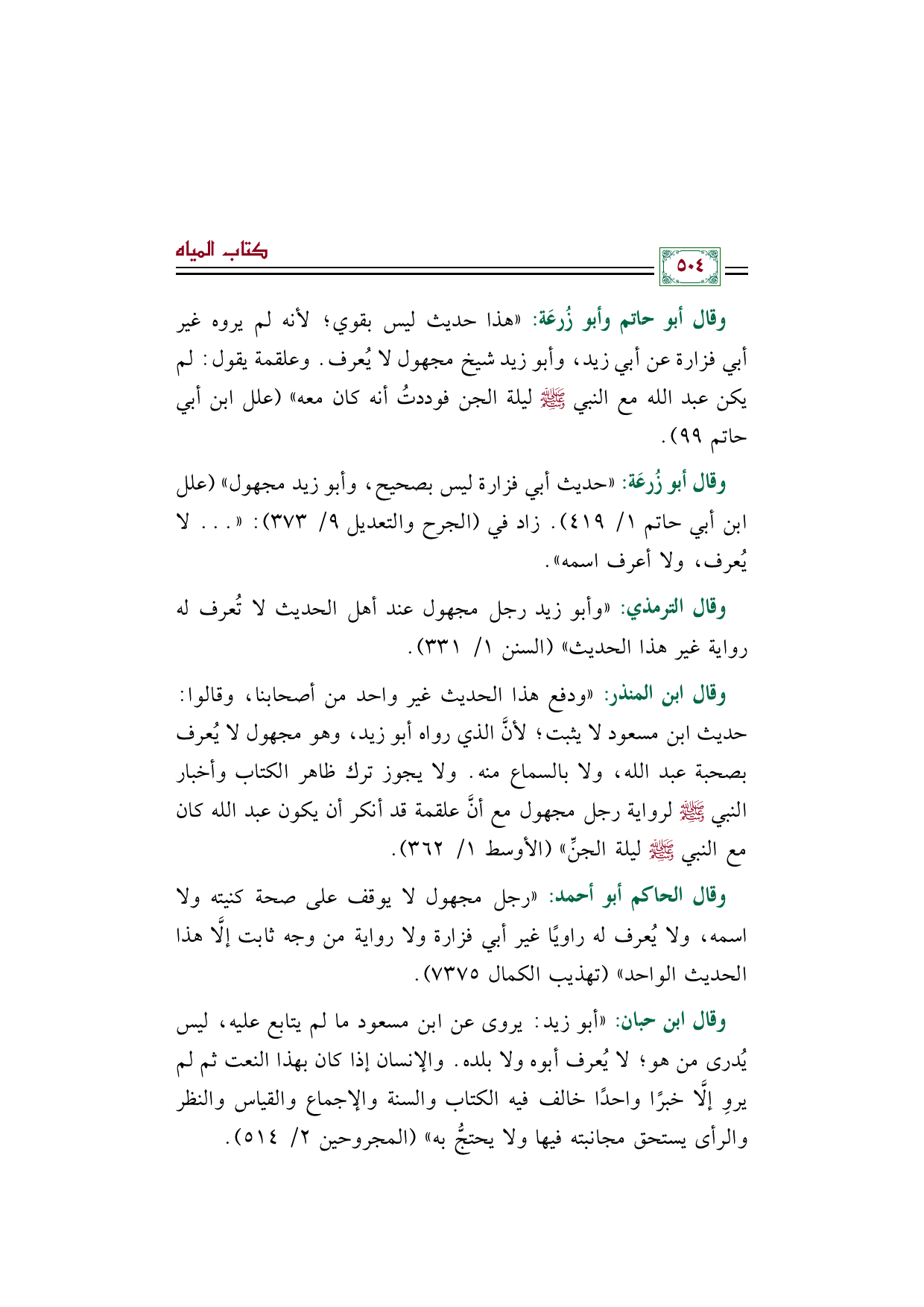 وقال ابن المنذر: ((ودفع هذا الحديث غير واحد من أصحابنا، وقالوا: حديث ابن مسعود لا يثبت؛ لأنَّ الذي رواه أبو زيد، وهو مجهول لا يُعرف بصحبة عبد الله، ولا بالسماع منه. ولا يجوز ترك ظاهر الكتاب وأخبار النبي صلى الله عليه وسلم لرواية رجل مجهول مع أنَّ علقمة قد أنكر أن يكون عبد الله كان مع النبي صلى الله عليه وسلم ليلة الجنِّ)) (الأوسط ١/ ٣٦٢).