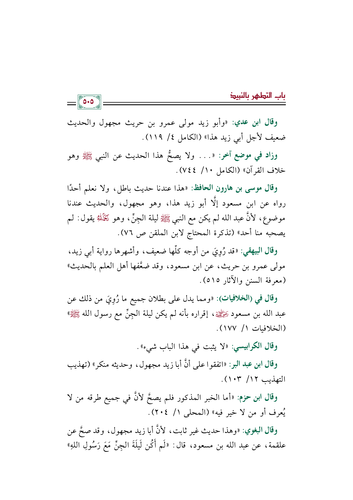 وقال موسى بن هارون الحافظ: ((هذا عندنا حديث باطل، ولا نعلم أحدًا رواه عن ابن مسعود إلَّا أبو زيد هذا، وهو مجهول، والحديث عندنا موضوع، لأنَّ عبد الله لم يكن مع النبي صلى الله عليه وسلم ليلة الجِنِّ، وهو رحمه الله يقول: لم يصحبه منا أحد)) (تذكرة المحتاج لابن الملقن ص ٧٦).