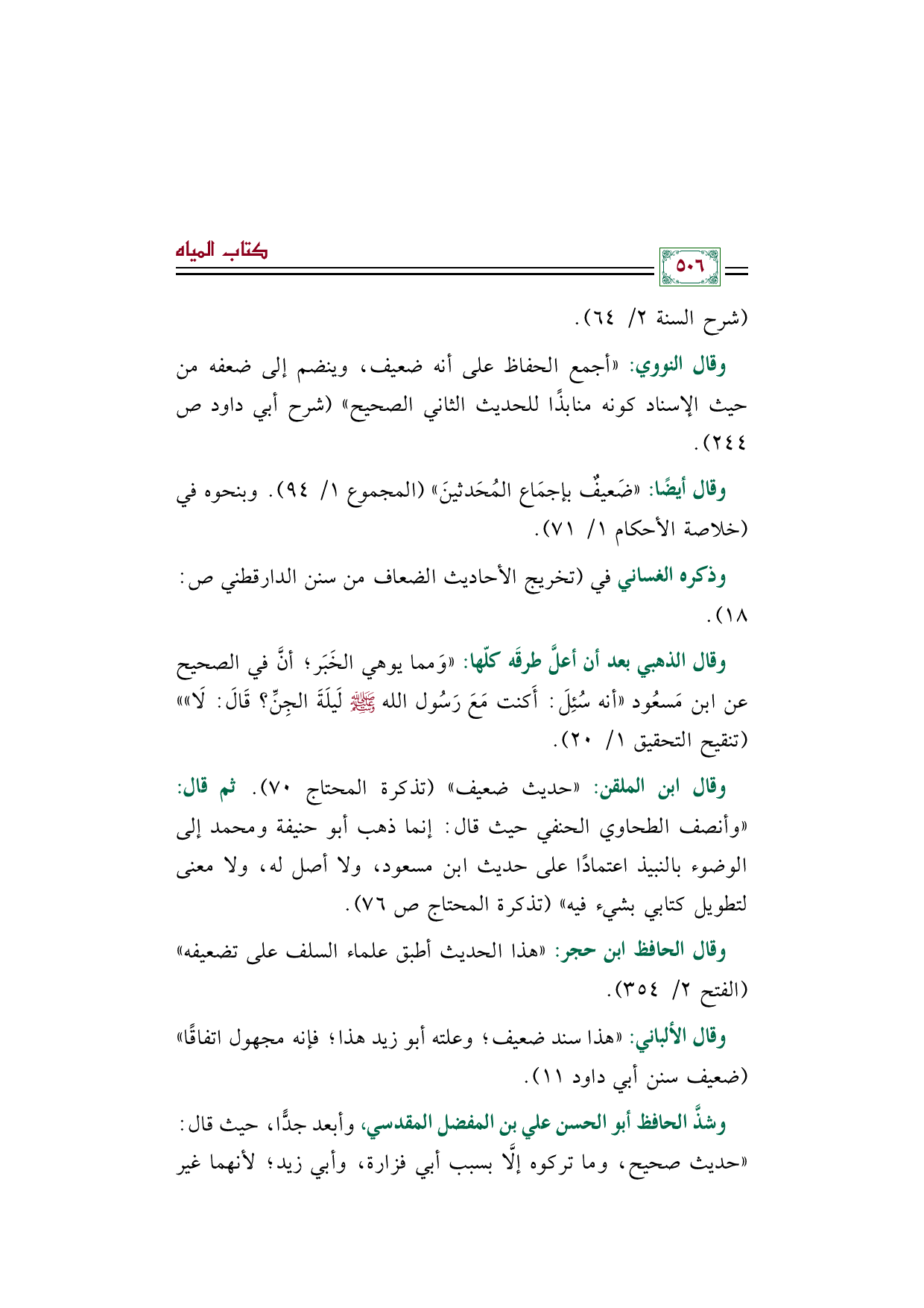 وقال ابن الملقن: ((حديث ضعيف)) (تذكرة المحتاج ٧٠). ثم قال: ((وأنصف الطحاوي الحنفي حيث قال: إنما ذهب أبو حنيفة ومحمد إلى الوضوء بالنبيذ اعتمادًا على حديث ابن مسعود، ولا أصل له، ولا معنى لتطويل كتابي بشيء فيه)) (تذكرة المحتاج ص ٧٦).