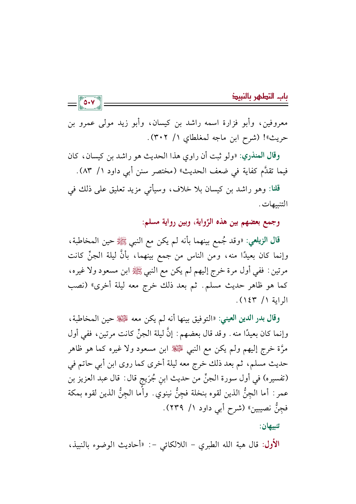 وقال بدر الدين العيني: ((التوفيق بينها أنه لم يكن معه عليه السلام حين المخاطبة، وإنما كان بعيدًا منه. وقد قال بعضهم: إنَّ ليلة الجنِّ كانت مرتين، ففي أول مرَّة خرج إليهم ولم يكن مع النبي عليه السلام ابن مسعود ولا غيره كما هو ظاهر حديث مسلم، ثم بعد ذلك خرج معه ليلة أخرى كما روى ابن أبي حاتم في (تفسيره) في أول سورة الجنِّ من حديث ابنِ جُرَيجٍ قال: قال عبد العزيز بن عمر: أما الجِنُّ الذين لقوه بنخلة فجِنُّ نينوي. وأما الجِنُّ الذين لقوه بمكة فجِنُّ نصيبين)) (شرح أبي داود ١/ ٢٣٩).