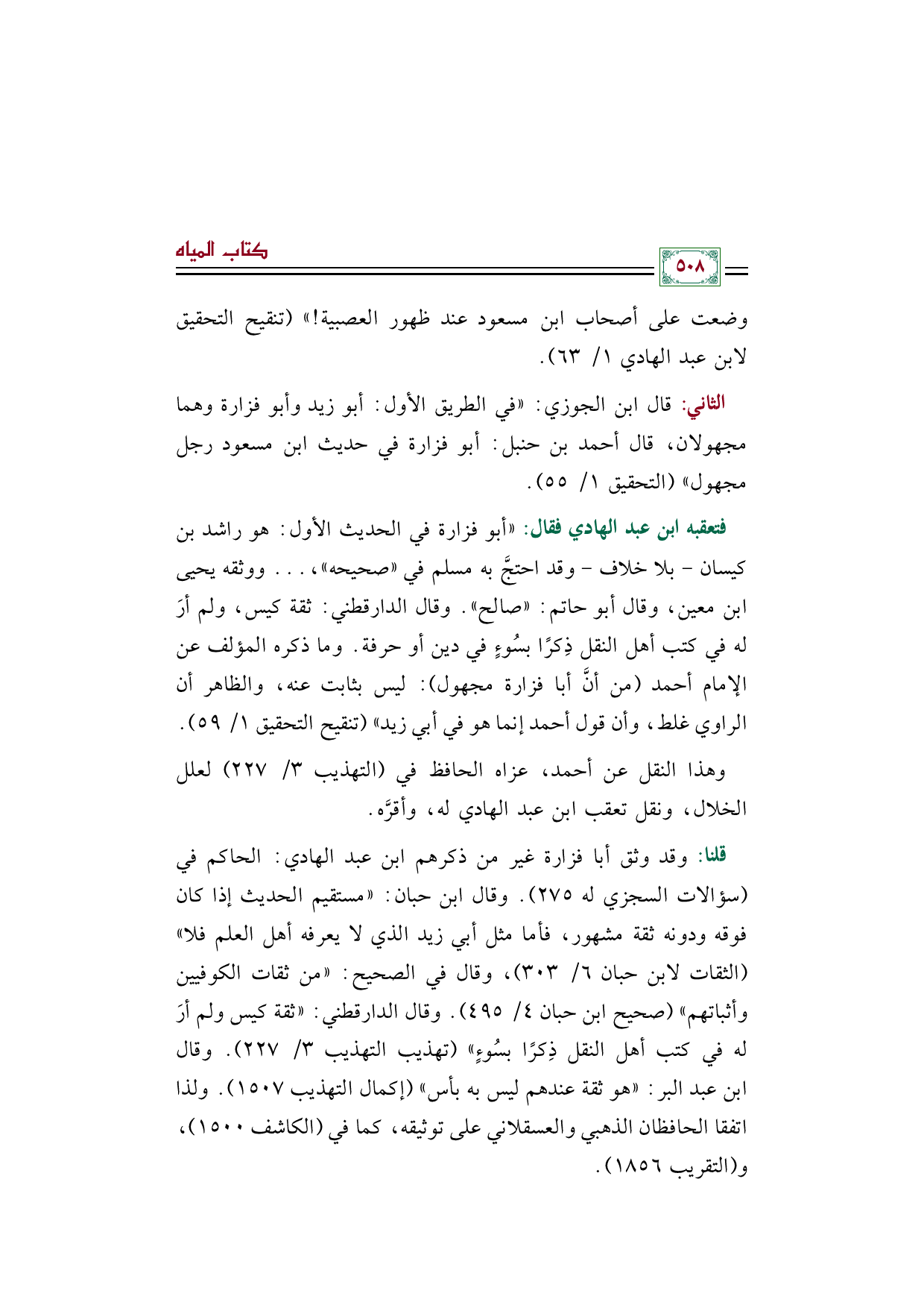 فتعقبه ابن عبد الهادي فقال: ((أبو فزارة في الحديث الأول: هو راشد بن كيسان - بلا خلاف - وقد احتجَّ به مسلم في ((صحيحه))، ... ووثقه يحيى بن معين، وقال أبو حاتم: ((صالح)). وقال الدارقطني: ثقة كيس، ولم أرَ له في كتب أهل النقل ذِكرًا بسُوءٍ في دين أو حرفة. وما ذكره المؤلف عن الإمام أحمد (من أنَّ أبا فزارة مجهول): ليس بثابت عنه، والظاهر أن الراوي غلط، وأن قول أحمد إنما هو في أبي زيد)) (تنقيح التحقيق ١/ ٥٩).