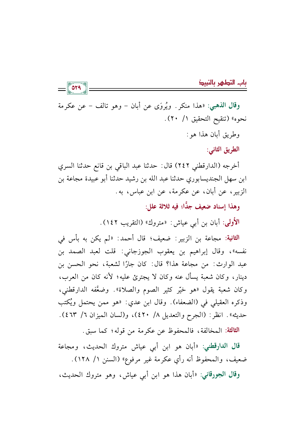 قال الدارقطني: ((أبان هو ابن أبي عياش متروك الحديث، ومجاعة ضعيف، والمحفوظ أنه رأي عكرمة غير مرفوع)) (السنن ١/ ١٢٨).