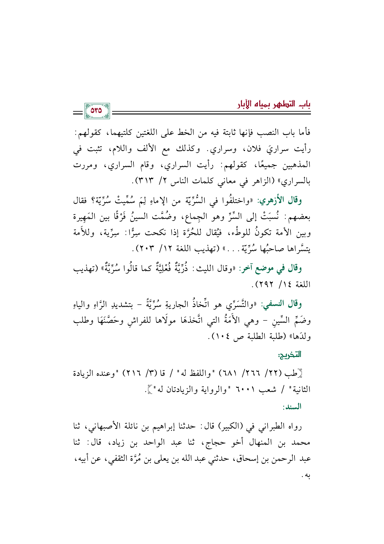 وقال الأزهري: ((واختلفُوا في السُّرِّيّة من الإماءِ لِمَ سُمِّيتْ سُرِّيّة؟ فقال بعضهم: نُسبَتْ إلى السِّرِّ وهو الجِماع، وضُمَّت السينُ فَرْقاً بين المَهِيرة وبين الأمة تكونُ للوطْء، فيُقال للحُرَّة إذا نكحت سِرّاً: سِرِّية، وللأَمة يتسَّراها صاحبُها سُرِّيّة .... )) (تهذيب اللغة ١٢/ ٢٠٣).