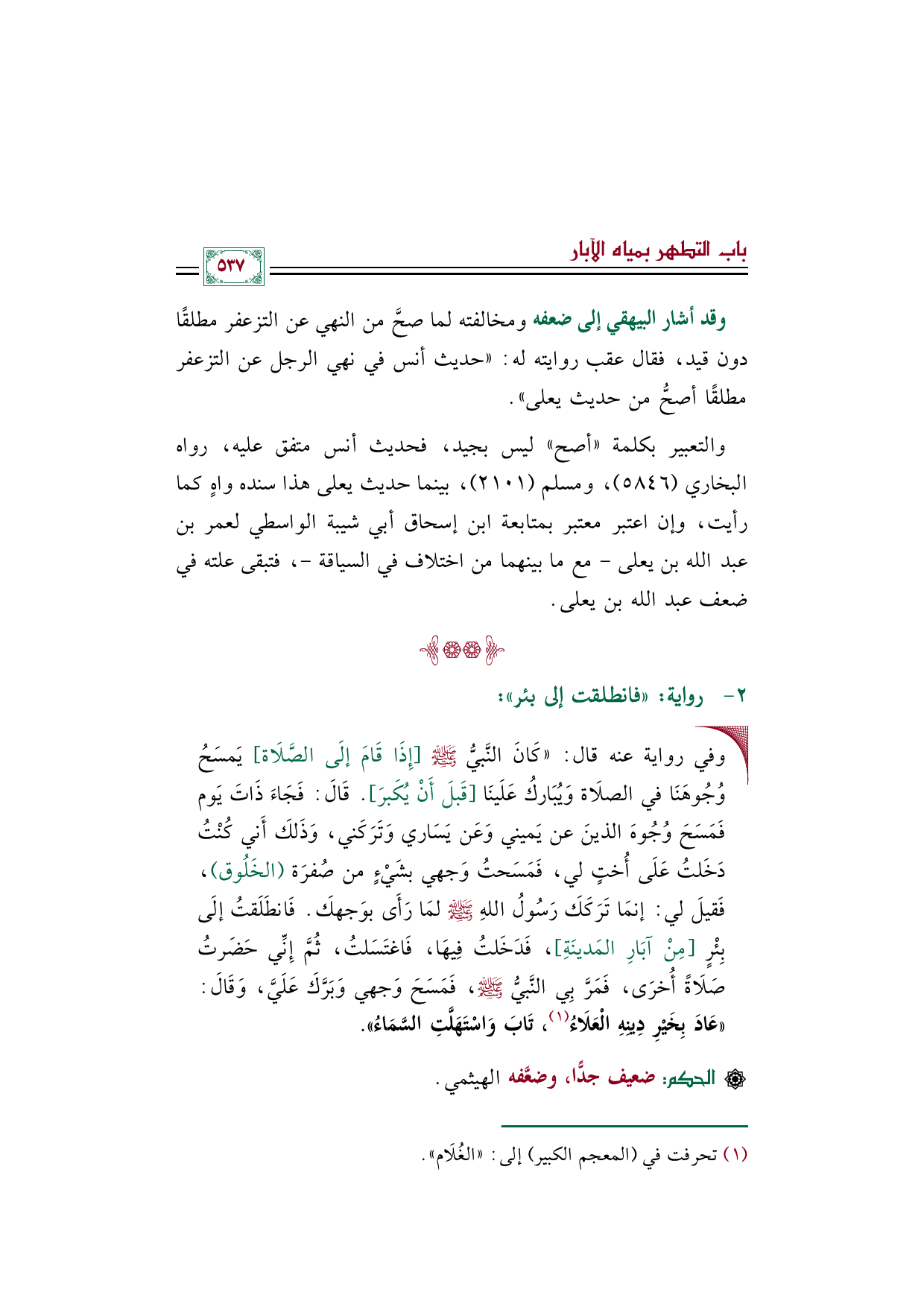 وقد أشار البيهقي إلى ضعفه ومخالفته لما صحَّ من النهي عن التزعفر مطلقًا دون قيد، فقال عقب روايته له: ((حديث أنس في نهي الرجل عن التزعفر مطلقًا أصحُّ من حديث يعلى)).