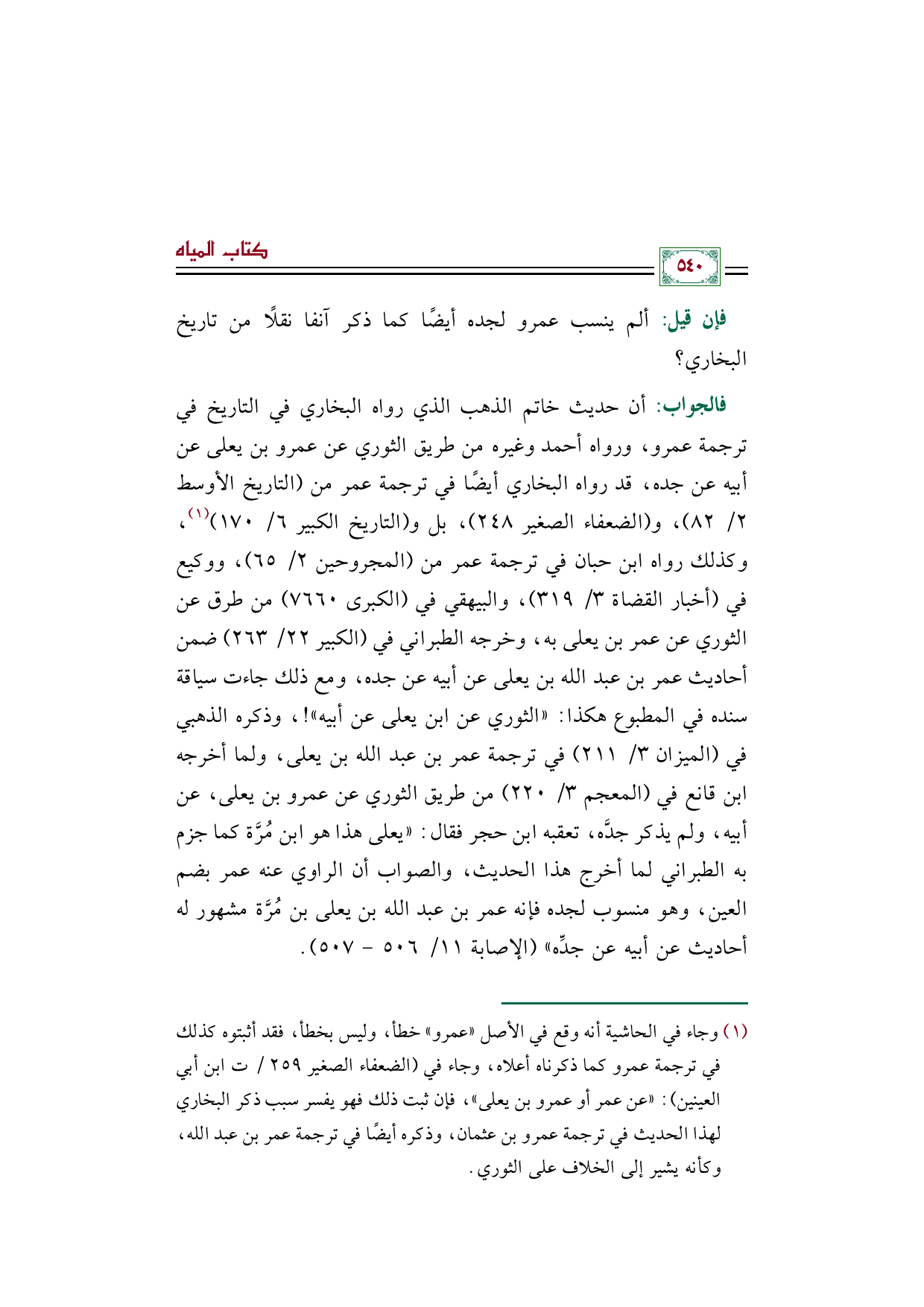 (¬١) وجاء في الحاشية أنه وقع في الأصل ((عمرو)) خطأ، وليس بخطأ، فقد أثبتوه كذلك في ترجمة عمرو كما ذكرناه أعلاه، وجاء في (الضعفاء الصغير ٢٥٩ / ت ابن أبي العينين): ((عن عمر أو عمرو بن يعلى))، فإن ثبت ذلك فهو يفسر سبب ذكر البخاري لهذا الحديث في ترجمة عمرو بن عثمان، وذكره أيضًا في ترجمة عمر بن عبد الله، وكأنه يشير إلى الخلاف على الثوري.