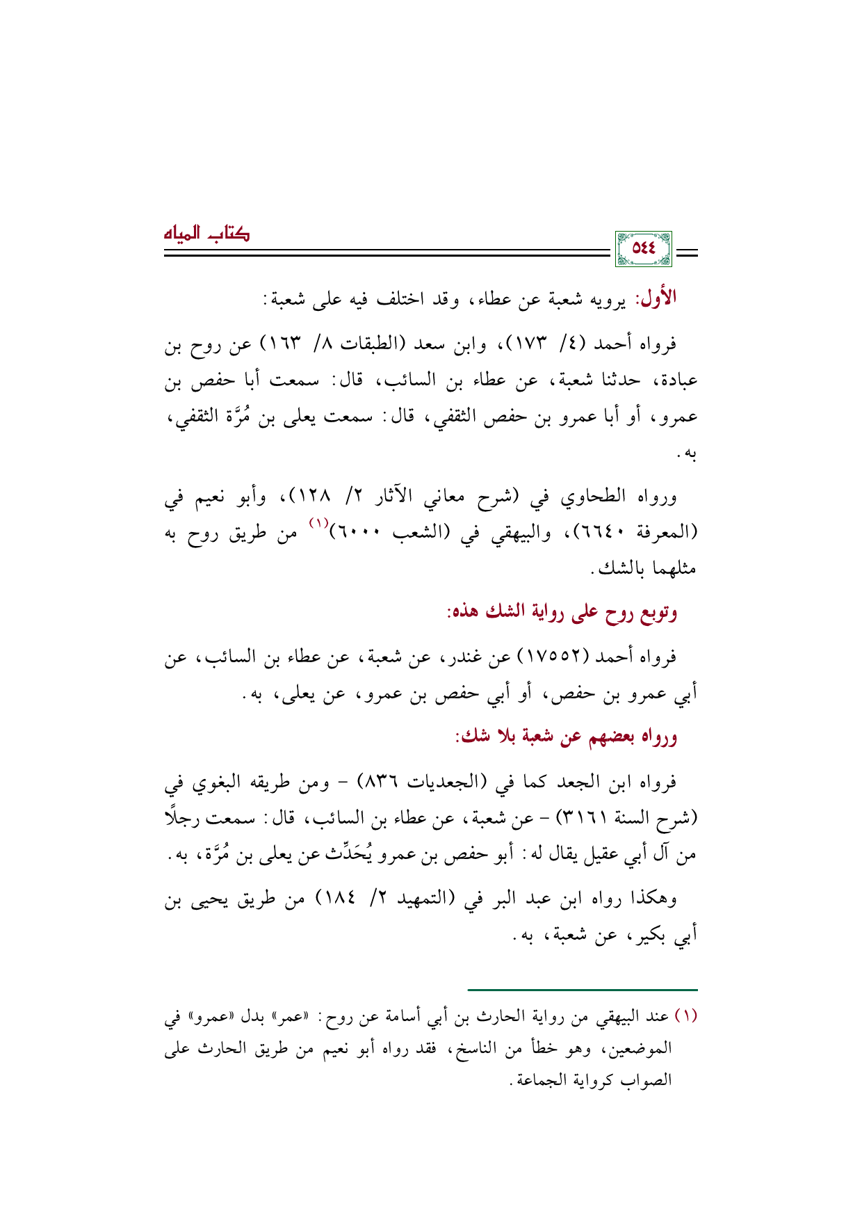فرواه أحمد (٤/ ١٧٣)، وابن سعد (الطبقات ٨/ ١٦٣) عن روح بن عبادة، حدثنا شعبة، عن عطاء بن السائب، قال: سمعت أبا حفص بن عمرو، أو أبا عمرو بن حفص الثقفي، قال: سمعت يعلى بن مُرَّة الثقفي، به.