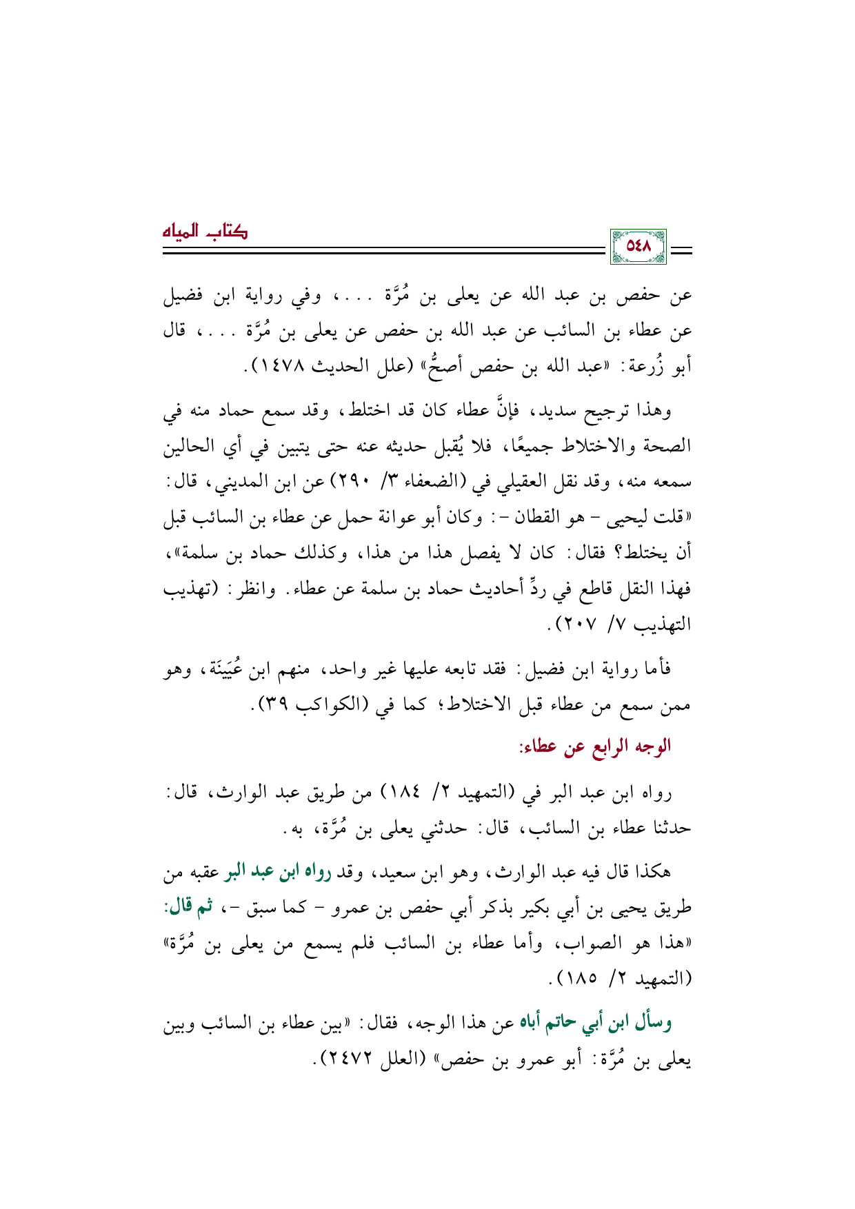 وهذا ترجيح سديد، فإنَّ عطاء كان قد اختلط، وقد سمع حماد منه في الصحة والاختلاط جميعًا، فلا يُقبل حديثه عنه حتى يتبين في أي الحالين سمعه منه، وقد نقل العقيلي في (الضعفاء ٣/ ٢٩٠) عن ابن المديني، قال: ((قلت ليحيى - هو القطان -: وكان أبو عوانة حمل عن عطاء بن السائب قبل أن يختلط؟ فقال: كان لا يفصل هذا من هذا، وكذلك حماد بن سلمة))، فهذا النقل قاطع في ردِّ أحاديث حماد بن سلمة عن عطاء. وانظر: (تهذيب التهذيب ٧/ ٢٠٧).