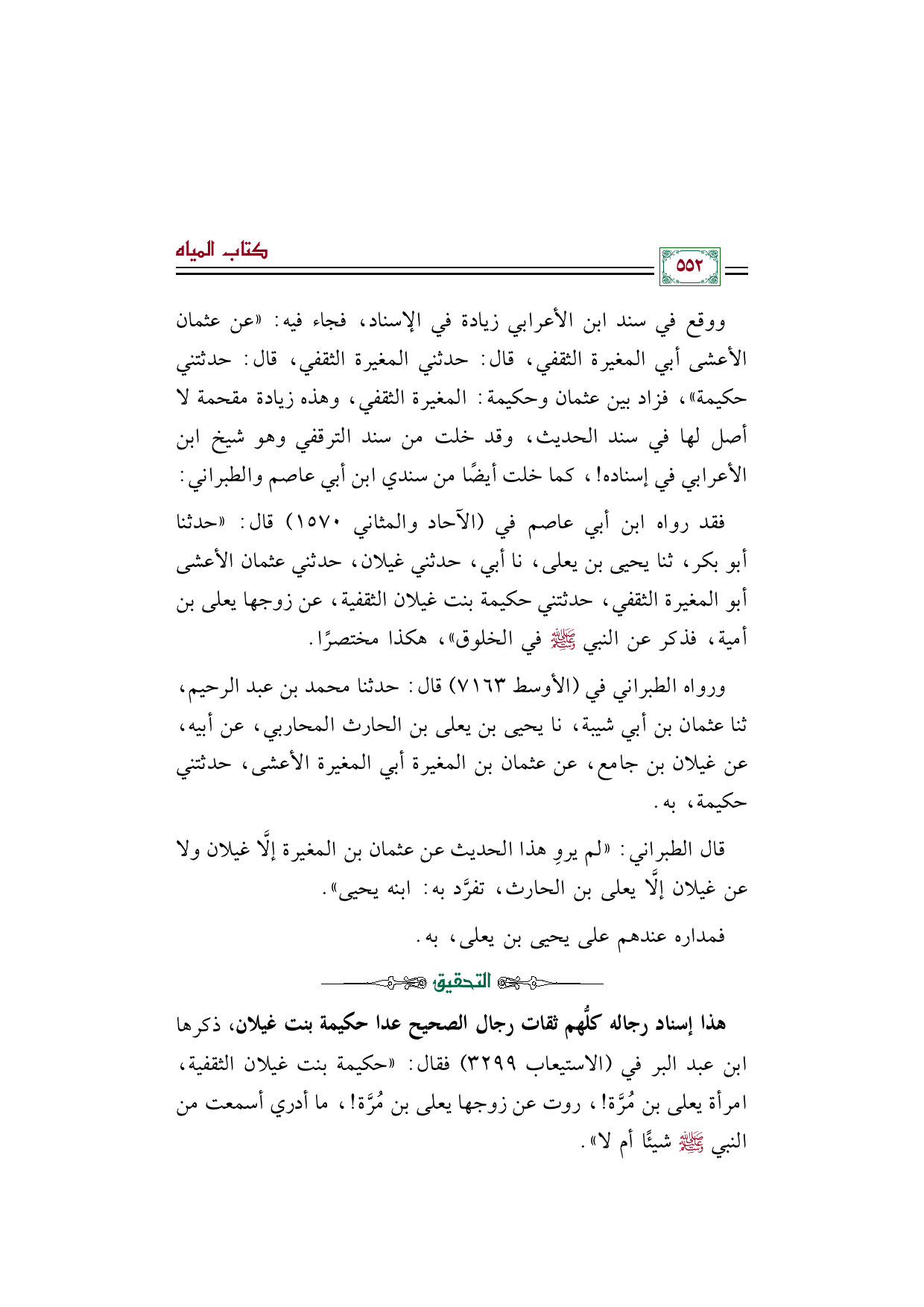 ووقع في سند ابن الأعرابي زيادة في الإسناد، فجاء فيه: ((عن عثمان الأعشى أبي المغيرة الثقفي، قال: حدثني المغيرة الثقفي، قال: حدثتني حكيمة))، فزاد بين عثمان وحكيمة: المغيرة الثقفي، وهذه زيادة مقحمة لا أصل لها في سند الحديث، وقد خلت من سند الترقفي وهو شيخ ابن الأعرابي في إسناده! ، كما خلت أيضًا من سندي ابن أبي عاصم والطبراني: