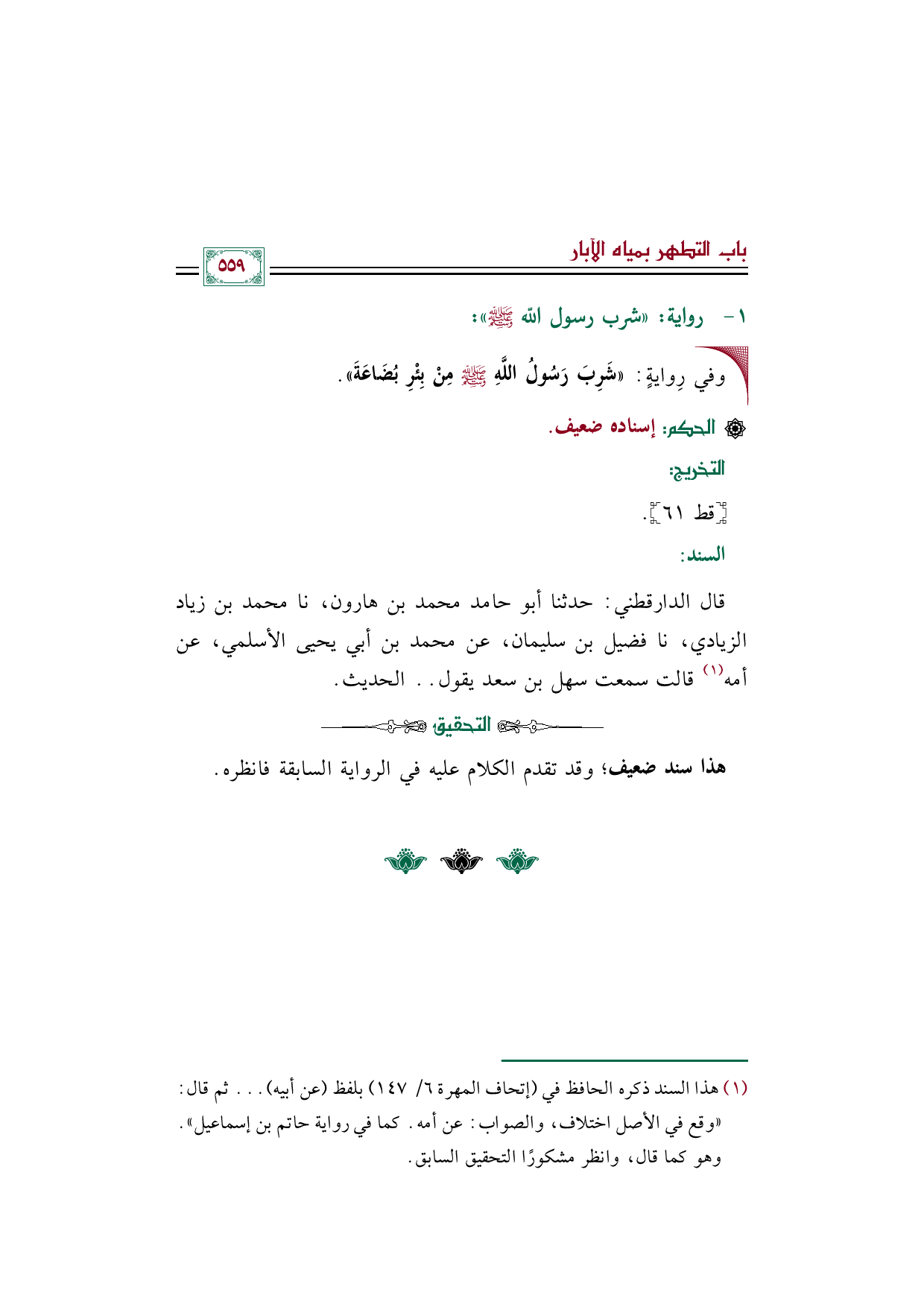 • وفي رِوايةٍ: ((شَرِبَ رَسُولُ اللَّهِ صلى الله عليه وسلم مِنْ بِئْرِ بُضَاعَةَ)).