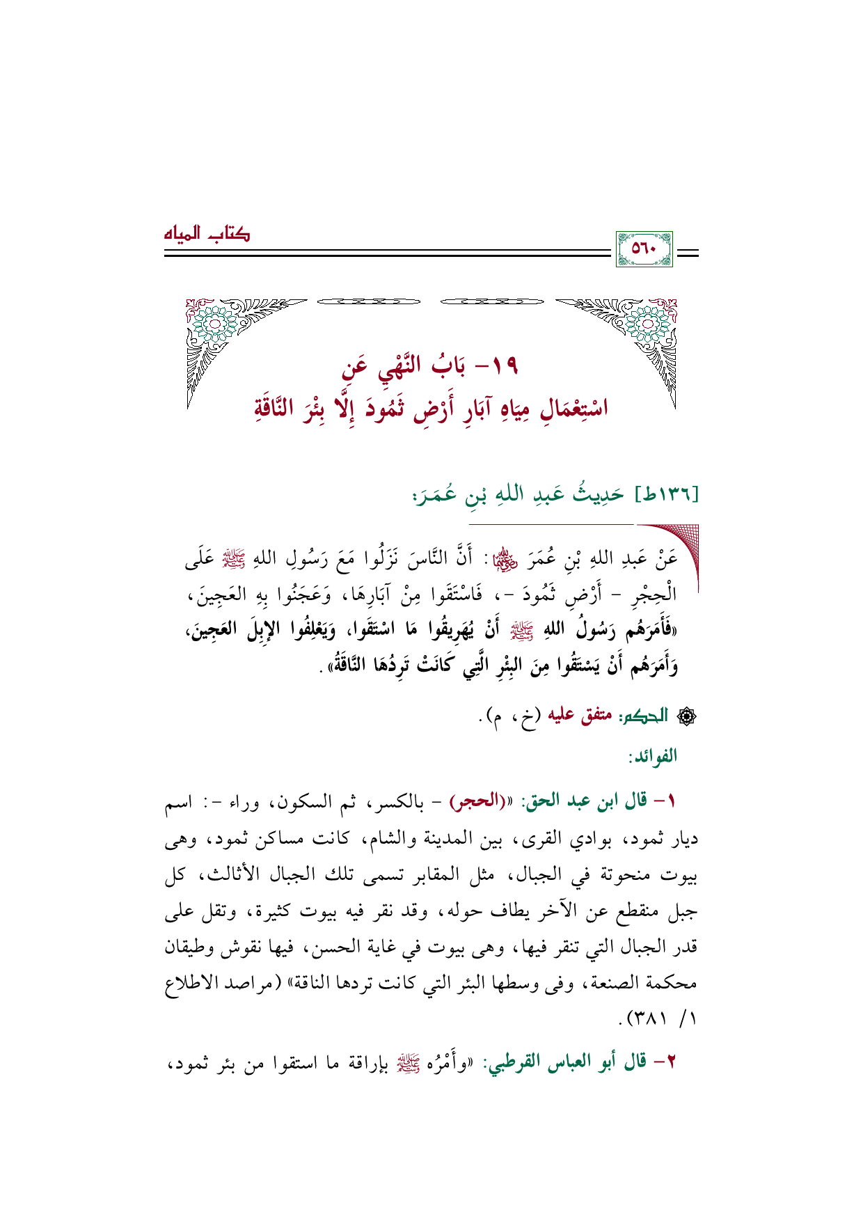 ◼ عَنْ عَبدِ اللهِ بْنِ عُمَرَ رضي الله عنهما: أَنَّ النَّاسَ نَزَلُوا مَعَ رَسُولِ اللهِ صلى الله عليه وسلم عَلَى الْحِجْرِ - أَرْضِ ثَمُودَ -، فَاسْتَقَوا مِنْ آبَارِهَا، وَعَجَنُوا بِهِ العَجِينَ، ((فَأَمَرَهُم رَسُولُ اللهِ صلى الله عليه وسلم أَنْ يُهَرِيقُوا مَا اسْتَقَوا، وَيَعْلِفُوا الإِبِلَ العَجِينَ، وَأَمَرَهُم أَنْ يَسْتَقُوا مِنَ البِئْرِ الَّتِي كَانَتْ تَرِدُهَا النَّاقَةُ)).