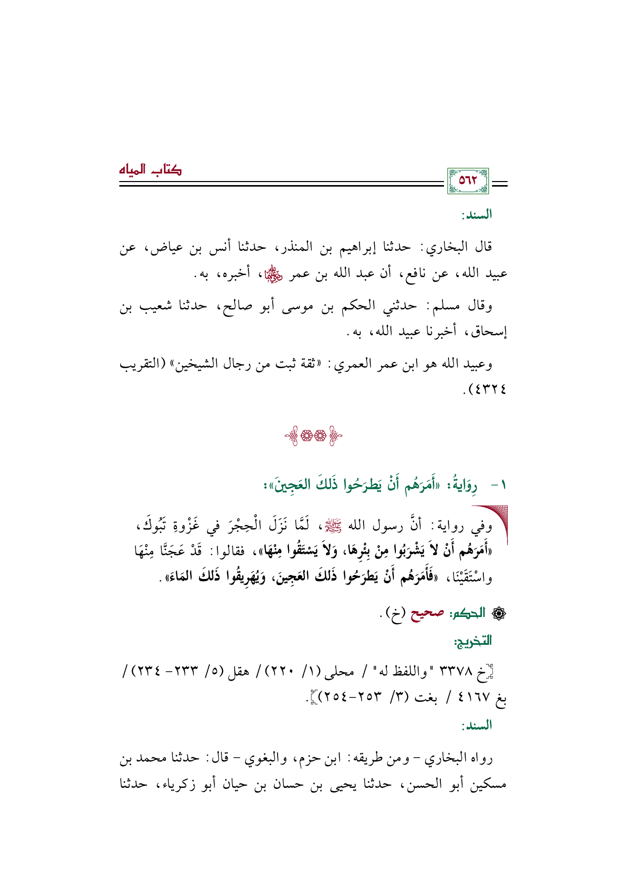 وفي رواية: أنَّ رسول الله صلى الله عليه وسلم، لَمَّا نَزَلَ الْحِجْرَ في غَزْوةِ تَبُوكَ، ((أَمَرَهُم أَنْ لا يَشْرَبُوا مِنْ بِئْرِهَا، وَلا يَسْتَقُوا مِنْهَا))، فقالوا: قَدْ عَجَنَّا مِنْهَا واسْتَقَيْنَا، ((فَأَمَرَهُم أَنْ يَطرَحُوا ذَلكَ العَجِينَ، وَيُهَرِيقُوا ذَلكَ المَاءَ)).