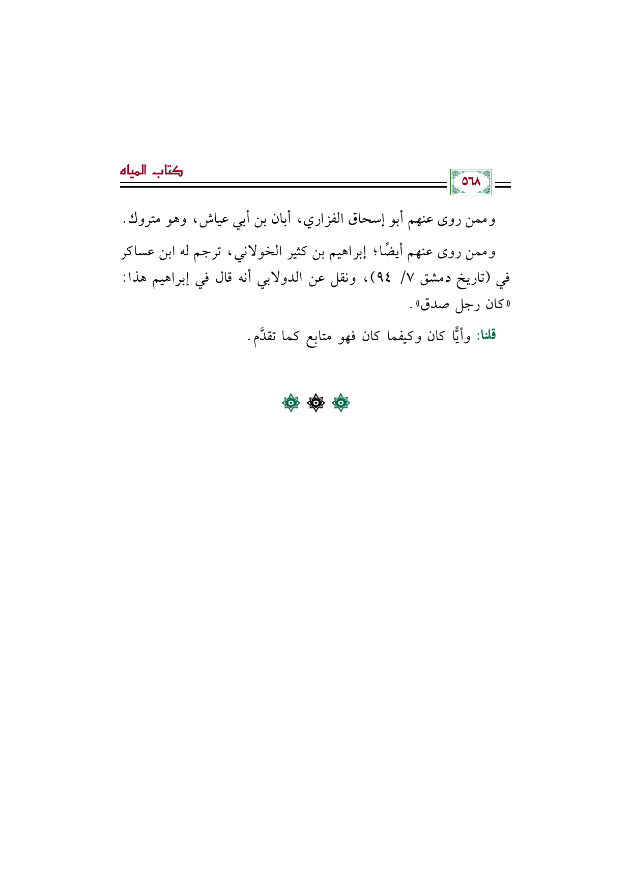 وممن روى عنهم أيضًا؛ إبراهيم بن كثير الخولاني، ترجم له ابن عساكر في (تاريخ دمشق ٧/ ٩٤)، ونقل عن الدولابي أنه قال في إبراهيم هذا: ((كان رجل صدق)).